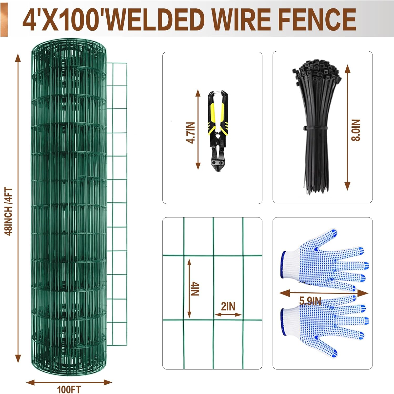 Tongmo 4 ft x 100 ft Green PVC Coated Welded Wire Fence, 16GA Garden Chicken Wire Fence Roll, Mesh Size 2" x 4" Hardware Cloth, Ideal for Yard Protection and Poultry Netting