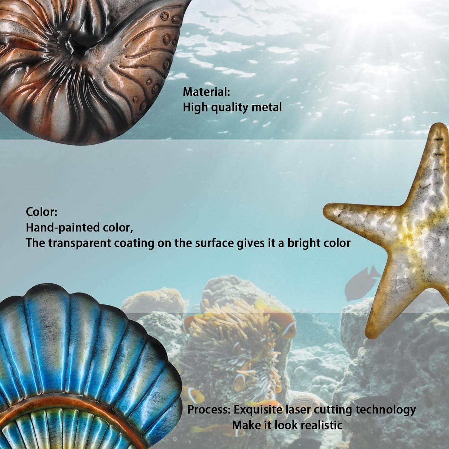 - Metal conch, starfish, and seashell ocean decorations, with exquisite appearance and realistic design, allow you to feel the ocean atmosphere in your home environment and bring you a happy mood.
