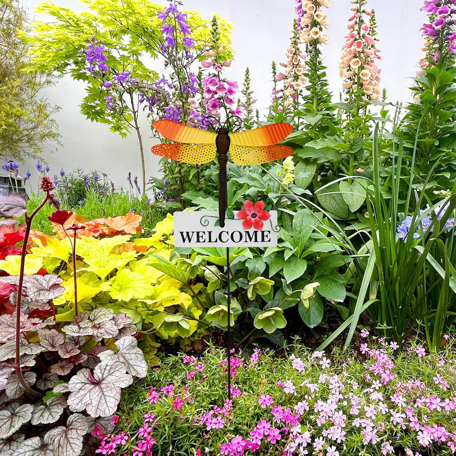 - DETAILED GARDEN DECOR: Metal dragonfly garden stake is hand painted with vivid colors and decorated with flower and welcome sign. The garden stake decor will definitely be an eye catching garden decor. The garden decor insect is connected to the stems by springs, when the breeze blows, it will nod or shake head and look lifelike.