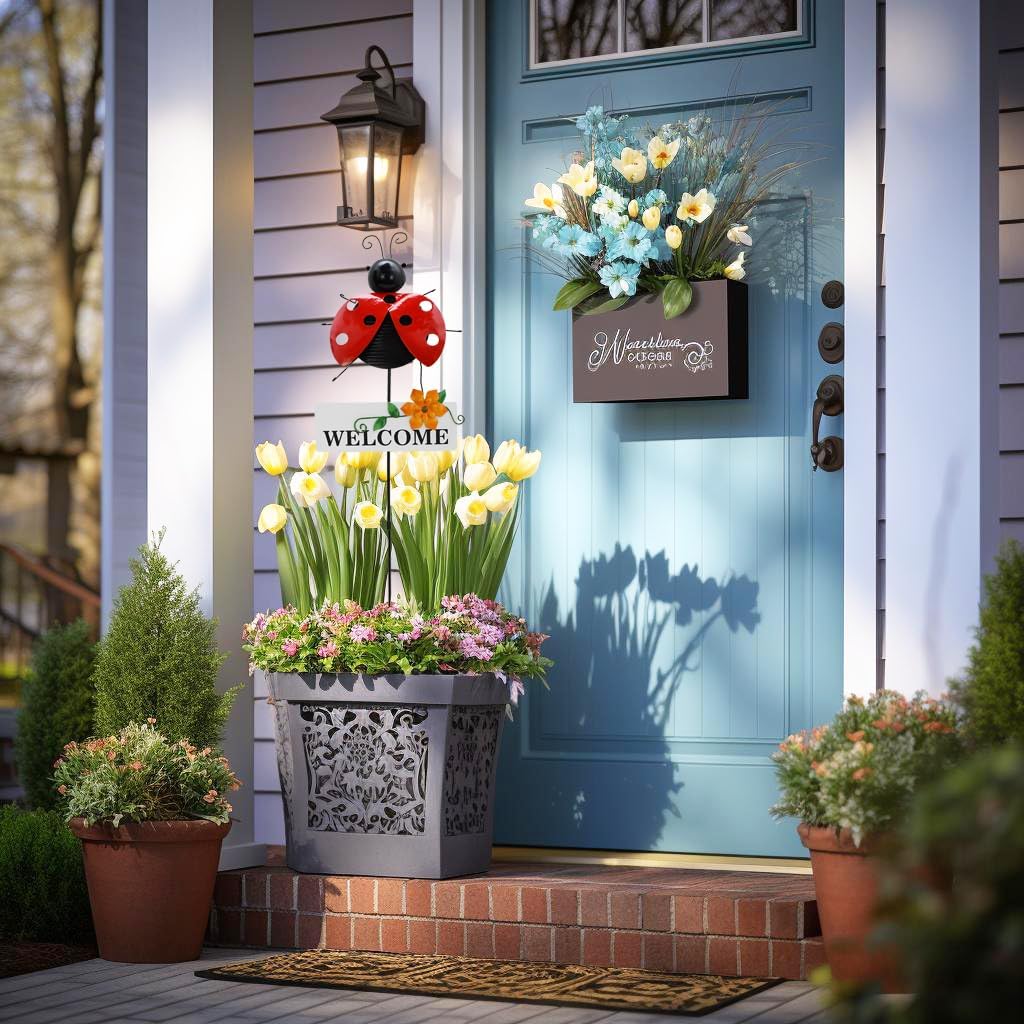- DETAILED GARDEN DECOR: Metal ladybug garden stake is hand painted with vivid red colors and decorated with flower and welcome sign. The garden stake decor will definitely be an eye catching garden decor. The garden decor insect is connected to the stems by springs, when the breeze blows, it will nod or shake head and look lifelike.