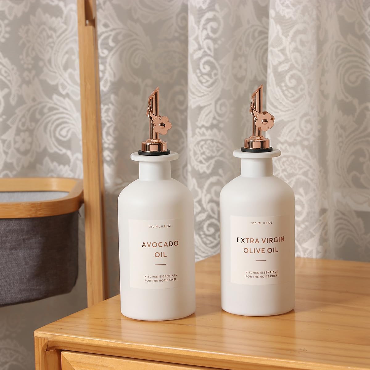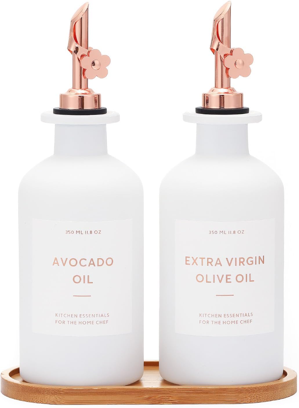 - KITCHEN OLIVE OIL DISPENSER BOTTLES – The oil and vinegar dispenser set contains 2 white 11.8oz (350ML) glass bottles, 2 rose gold stainless steel oil spouts, 17 waterproof labels(kinds of oil and vinegar) and a bamboo tray, Ideal for safely store and dispense your olive oil and vinegar.