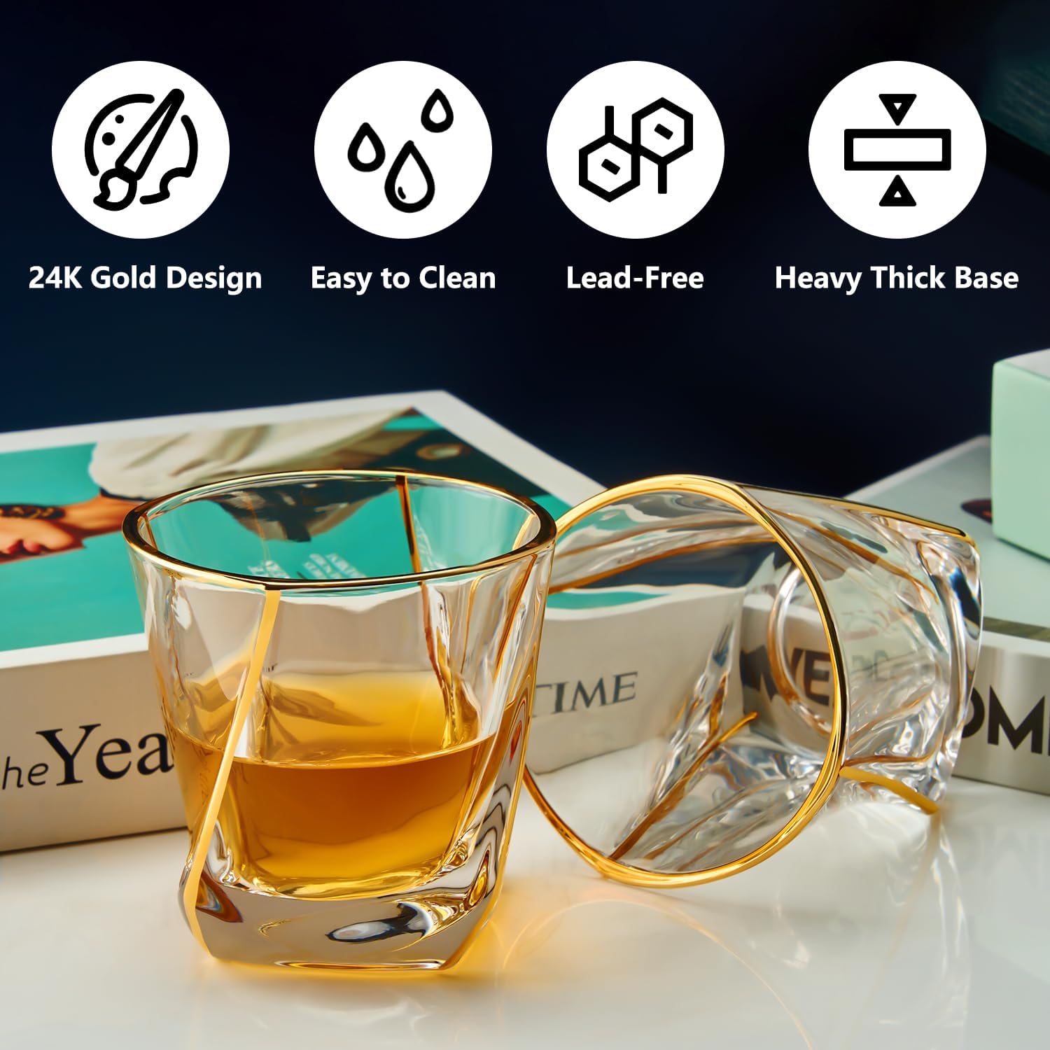 - 【24K Gold Hand Painted】Our old fashioned glass are made of high quality lead-free crystal glass, hand-painted with gold rims by skilled craftsmen, the combination of golden luxury and pure crystal is more noble and elegant, whiskey glasses set of 2 bring you and your family and friends an even more superior drinking experience.