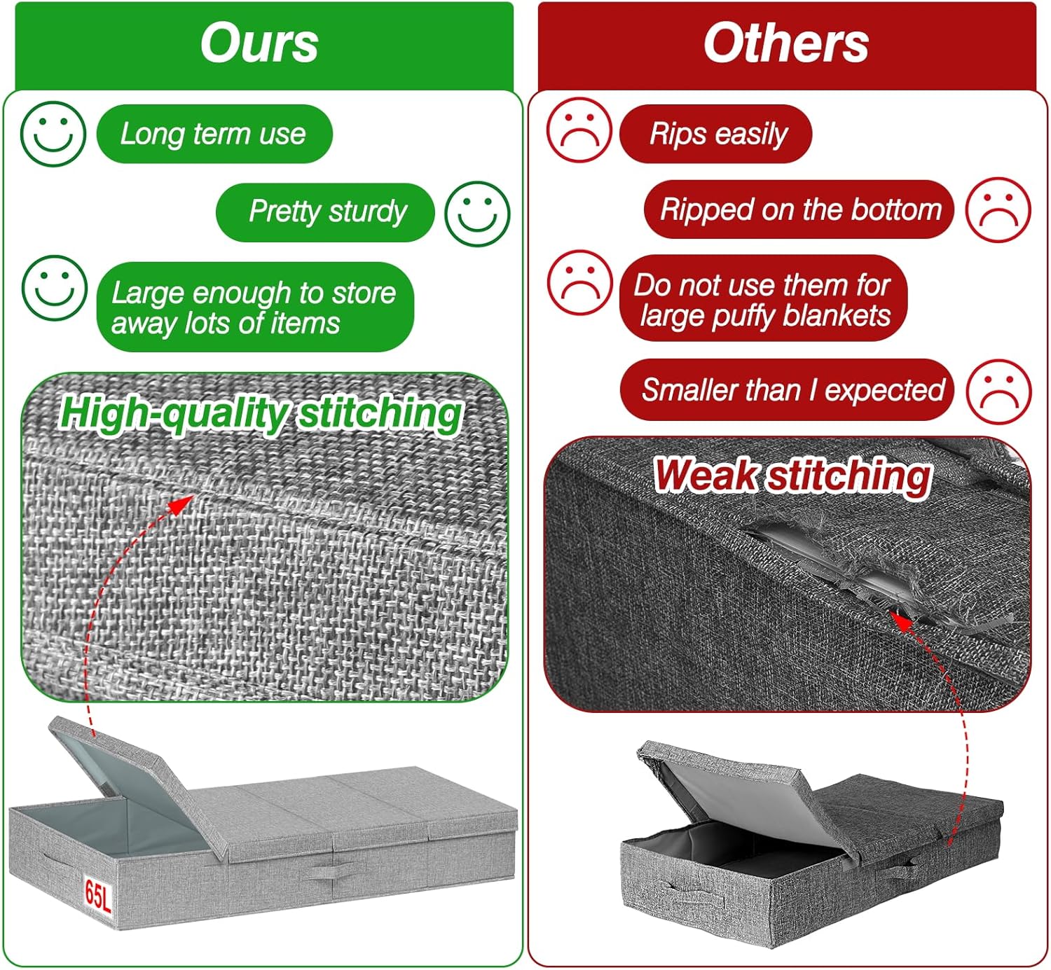 - STURDY STRUCTURE & STURDY HANDLES: Firm foldable bottom and sides, making the box more sturdy and stackable, keep it shape when empty; 3 Reinforced sewn-in handles make it easy maneuverability and convenient for you to carry and pull out from under the bed; handy bins make excellent blanket organizers and storage; Lasts longer than underbed storage containers plastic; Keep your bedroom neat and tidy with storage bins with lids that fit your room's existing decor and theme