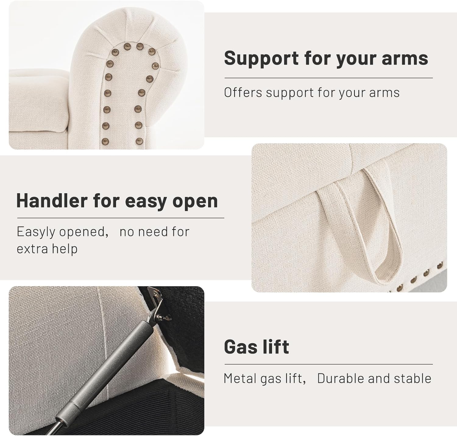 - ·Top-quality Planks&Sophisticated Mechanics: The ottoman bench frame made of multi-layer solid wood planks offers excellent breathability, durability, and support. The easy-lift and soft-close mechanism of the composite hinge and support arm structure ensures that the seat surface opens smoothly. It allows for easy and slow closure, providing a safe and effortless user experience.
