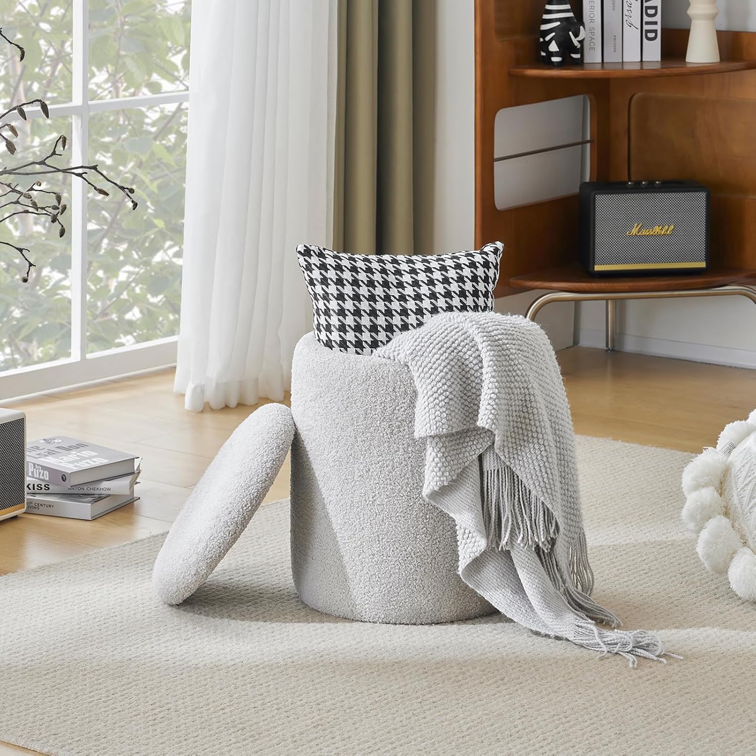 YFO Round Ottoman with Removable Lid Upholstered, Multifunctional Vanity Chairs for Makeup, Soft Footrest Stool Ottoman Foot Stool for Living Room, Bedroom, Boucle, Grey