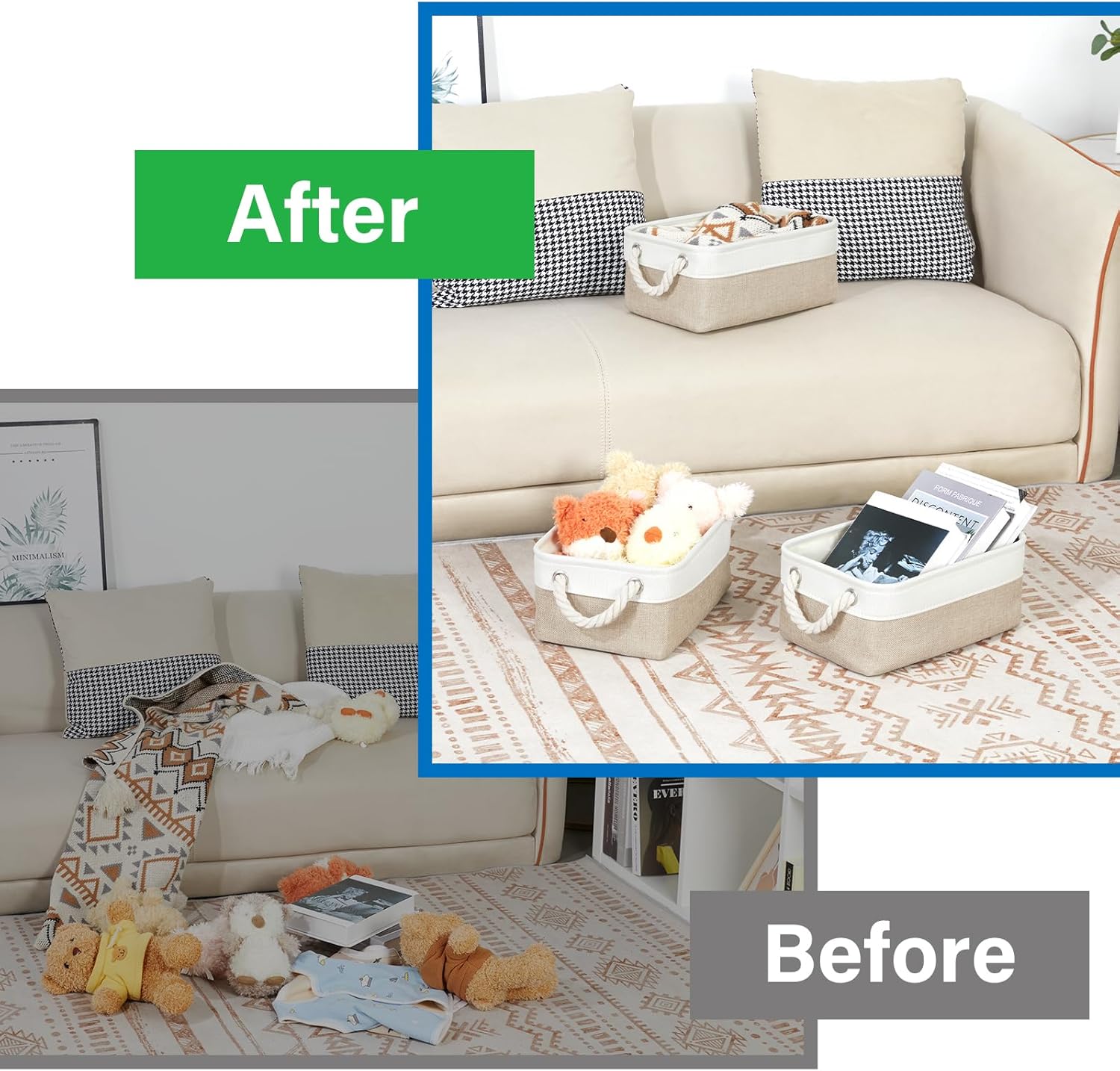 - Set of 3 Small Storage Baskets: The size of each fabric storage basket is 11.8 x 7.8 x 5 inches. Each Canvas storage bins are very light to transport items with less effort. Perfectly fit for most cube organizers, shelves closets or change tables. Sturdy and soft fabric baskets for home storage with good abrasion resistance