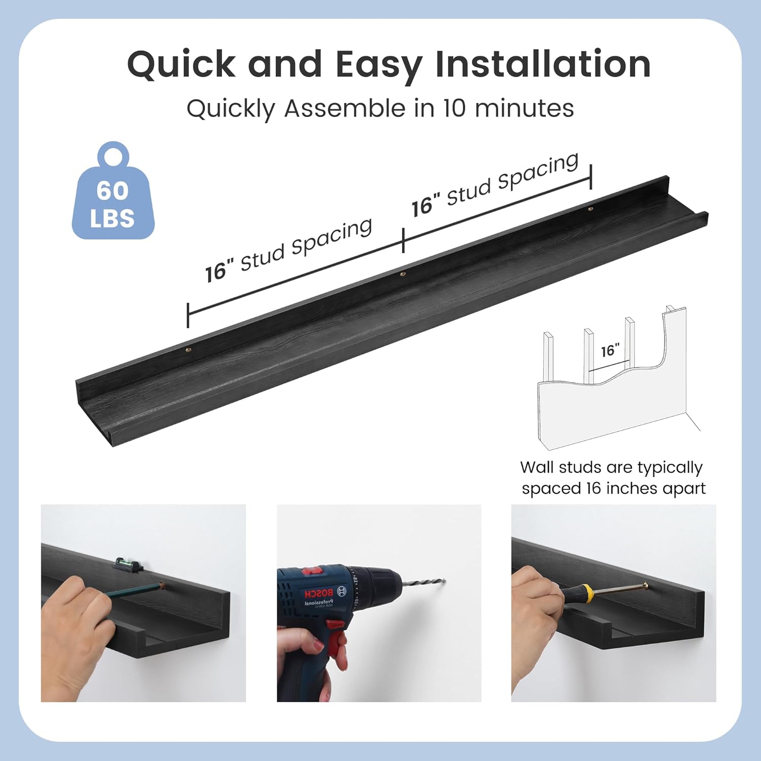 - Easy to Install: You will get a level, screws for the wall, drywall anchors, a detailed installation guide, and two beautiful hand-crafted solid pine wood shelves. With the level, you can make sure your picture ledge shelves are well aligned. Just follow the simple instruction to install the hanging shelves for wall decor within 10 minutes. We add additional screw and anchor to the hardware bag just in case. If you have any questions about our products, please feel free to contact us
