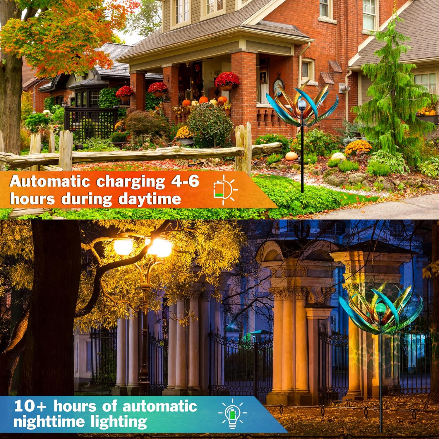 - Day & Night Garden Decoration: Adorn your outdoor space with this mesmerizing tulip-shaped wind spinner featuring solar-powered prismatic glass orbs. The waterproof LED clusters create ethereal light shows at dusk (10+ hours runtime), while its brushed metal petals dance gracefully in daylight. Perfect for enhancing flower beds, pathway edges, or poolside landscaping