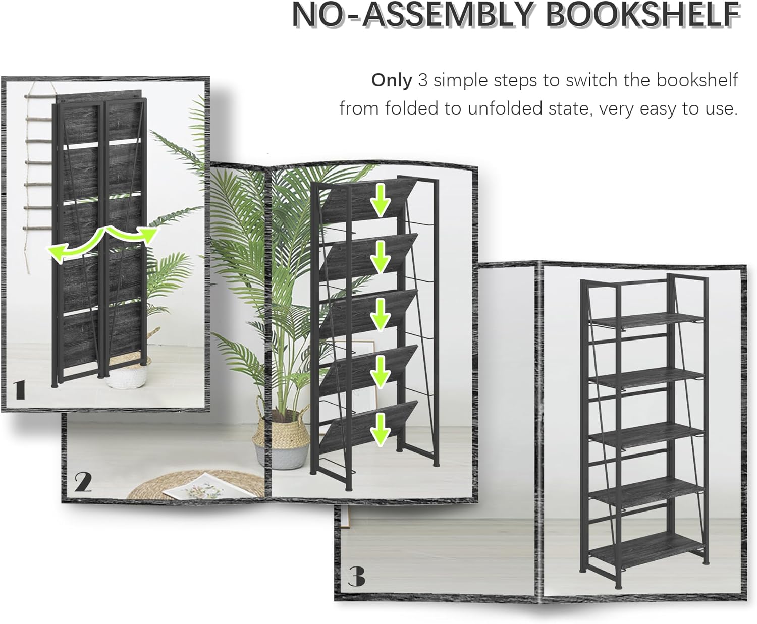 4NM No Assembly Foldable Bookshelf, 5-Shelf Collapsible Bookcase Storage for Small Spaces, 62.2" H, Gray and Black