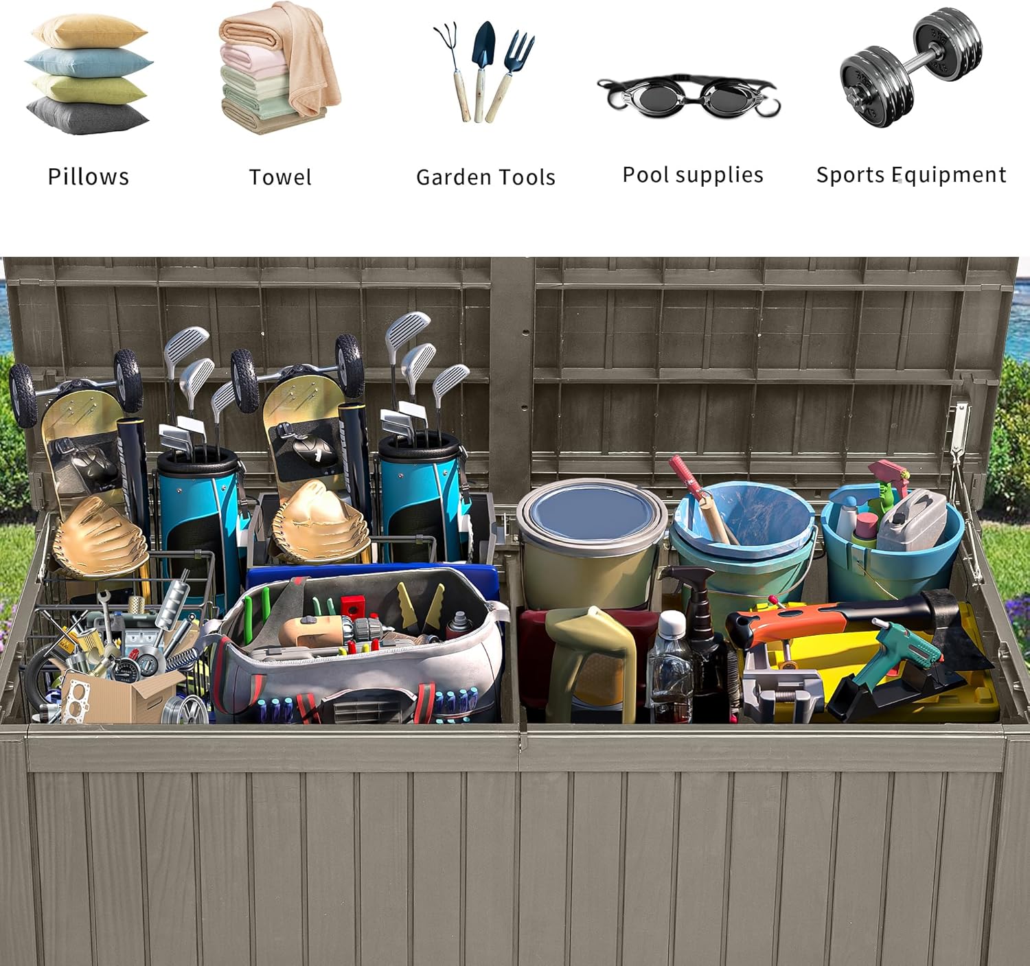 - Versatile Use: As a lockable storage box, it effortlessly integrates into any yard or patio; Ideal for storing furniture cushions, gardening tools, pool accessories, and more. The top layer can double as an extra table or stool with a stylish wood-like texture. Please note: the color may appear darker indoors and lighter outdoors; Always empty the box before moving to prevent accidents