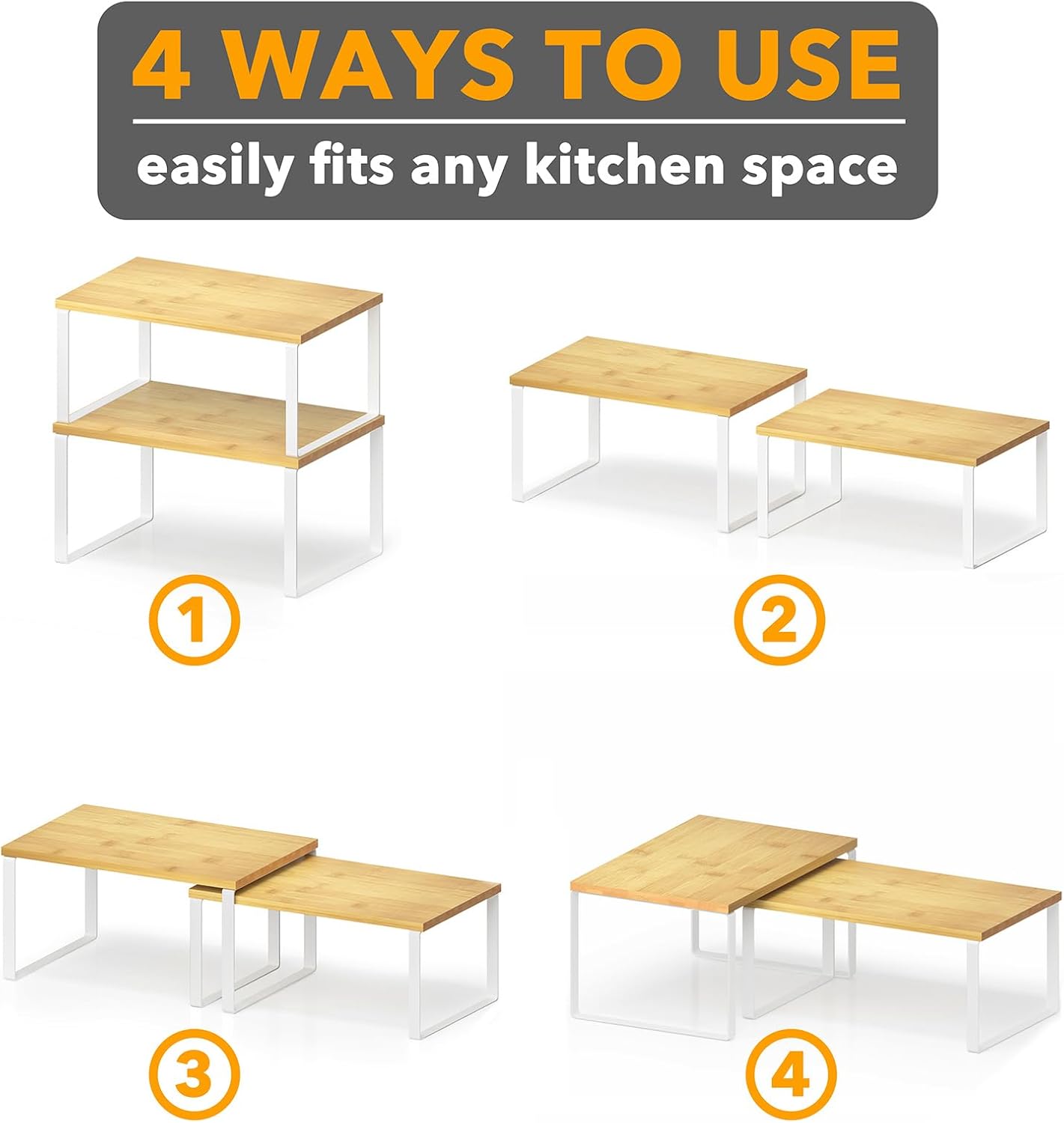 SpaceAid Cabinet Shelf Organizers 2 Pack, Kitchen Counter Rack Shelves Riser, Stackable Expandable Spice Rack, Pantry Cupboard Storage Organization (White and Natural, Short)