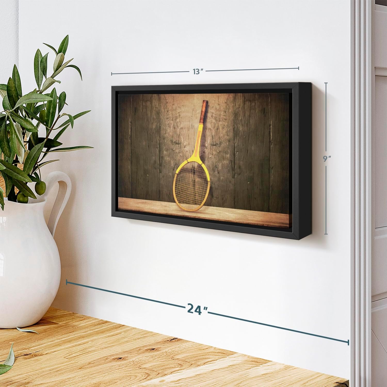 ElephantStock Vintage Tennis Racket Wall Art - Horizontal Framed Canvas - 1-Piece Living Room Wall Decor - Photography Sports Canvas Print - Brown and Black Decor for Wall - 13" X 9"