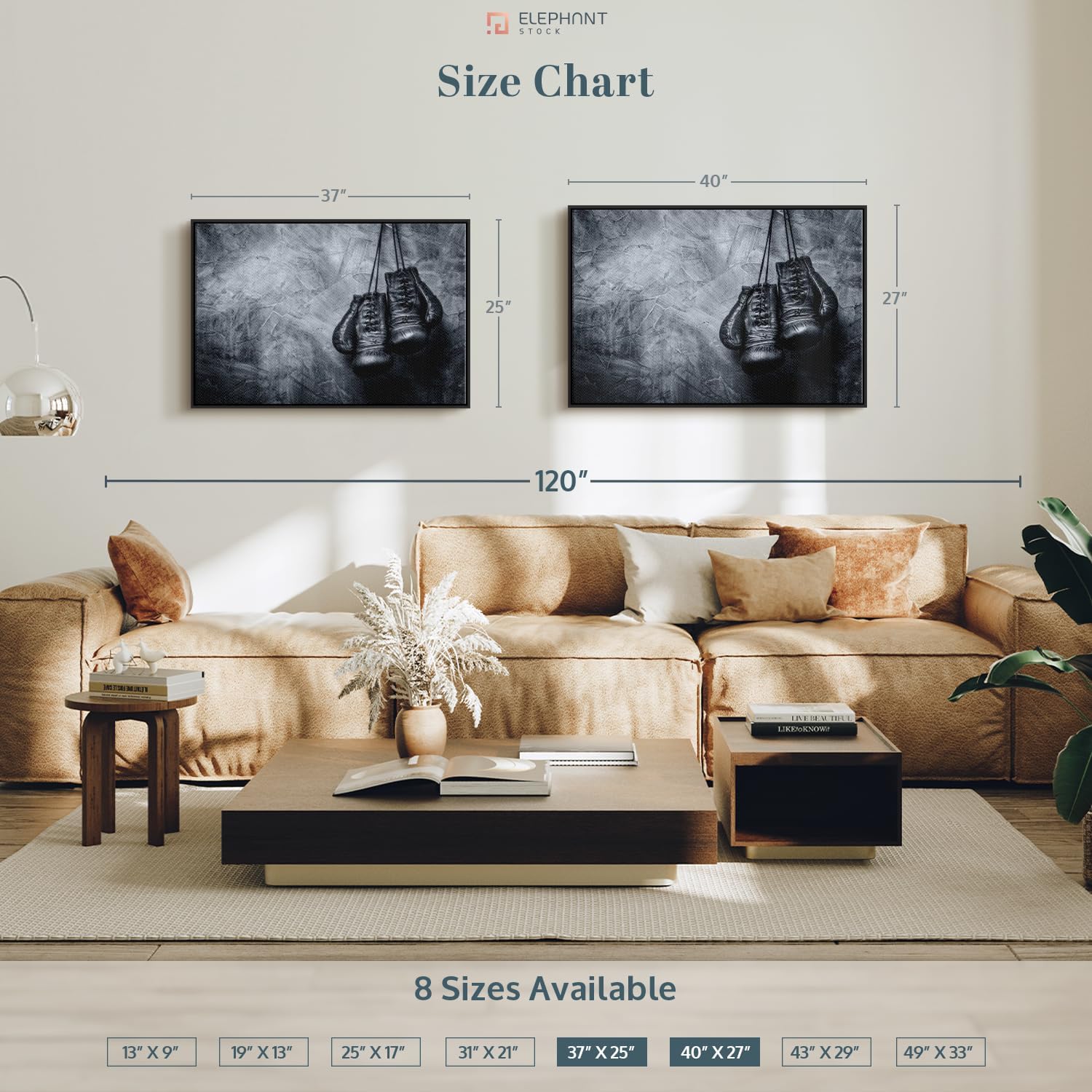 ElephantStock Boxing Gloves Wall Art - Horizontal Framed Canvas - 1-Piece Living Room Wall Decor - Photography Sports Canvas Print - Black and Gray Decor for Wall - 37" X 25"