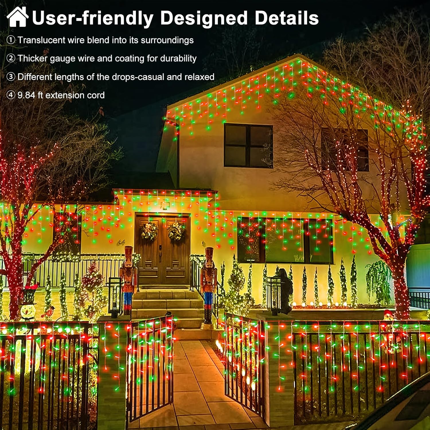 - 【Waterproof Christmas icicle lights】The xmas lights outdoor is perfect for outdoor using, including heavy rain and snow. Sealed LED beads, thick gauge wire and coating all are IP44 waterproof, they make the Christmas lights for outside durable and worked great through the season. But please kindly note that the plug is not waterproof, please do some protection or keep them away from water.