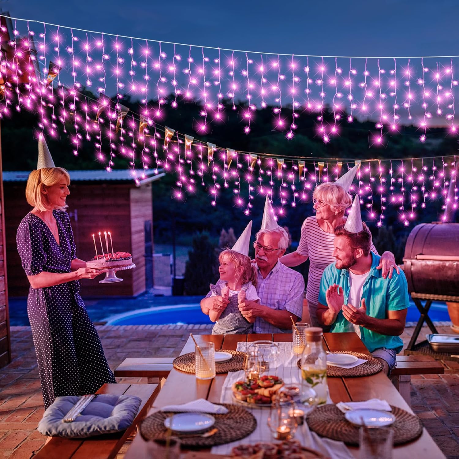 33ft Icicle Lights for Outside, Pink Christmas Lights Outdoor Waterproof for House, 400 LED Twinkle Light with 75 Drops Clear Wire Short Curtain Lights for Room Home Wall Indoor Decorations
