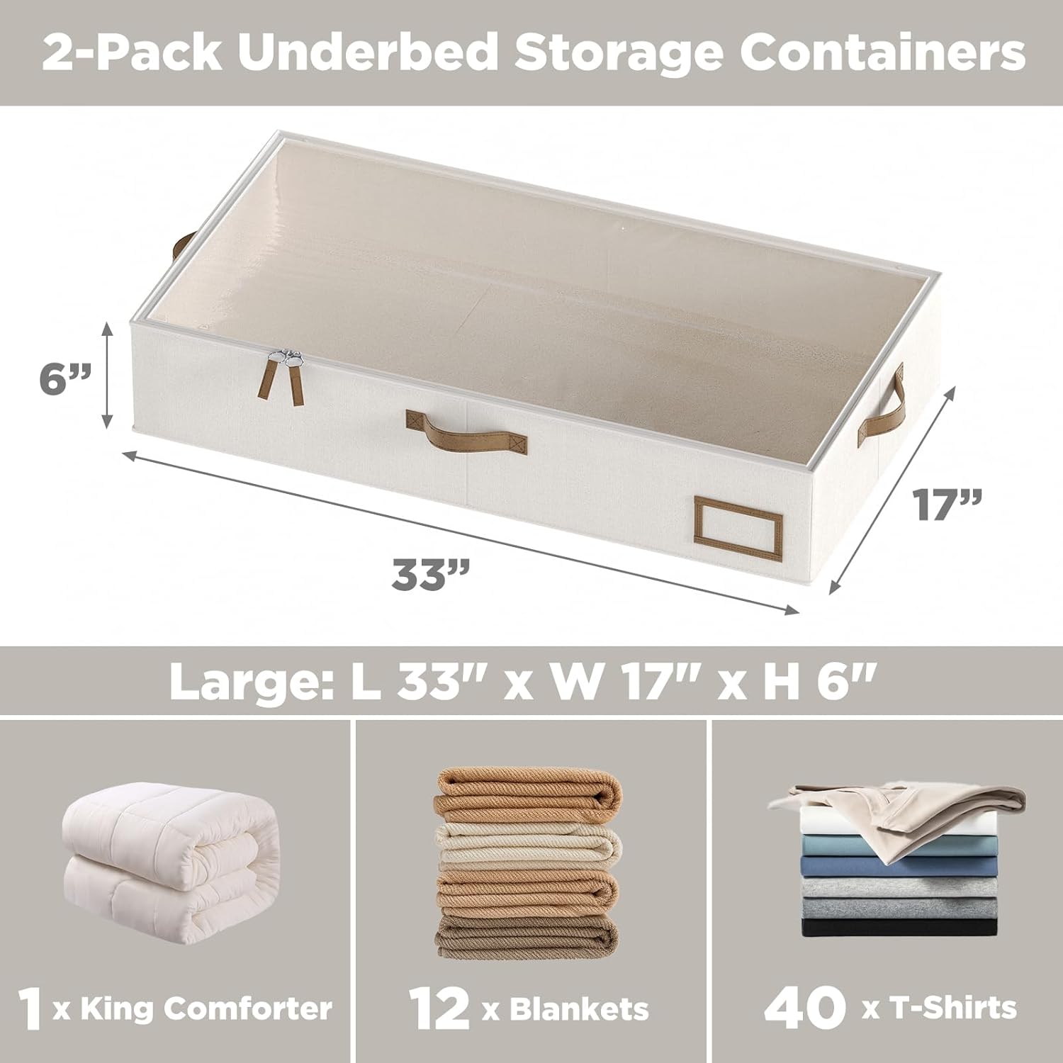 Under Bed Storage Containers, 2-Pack Underbed Storage Box, Collapsible Clothes Storage Bins with Handles and Lid, Large Under Bed Organizers for Shoe, Blanket, Toy, Pillow, Sheet, Beige