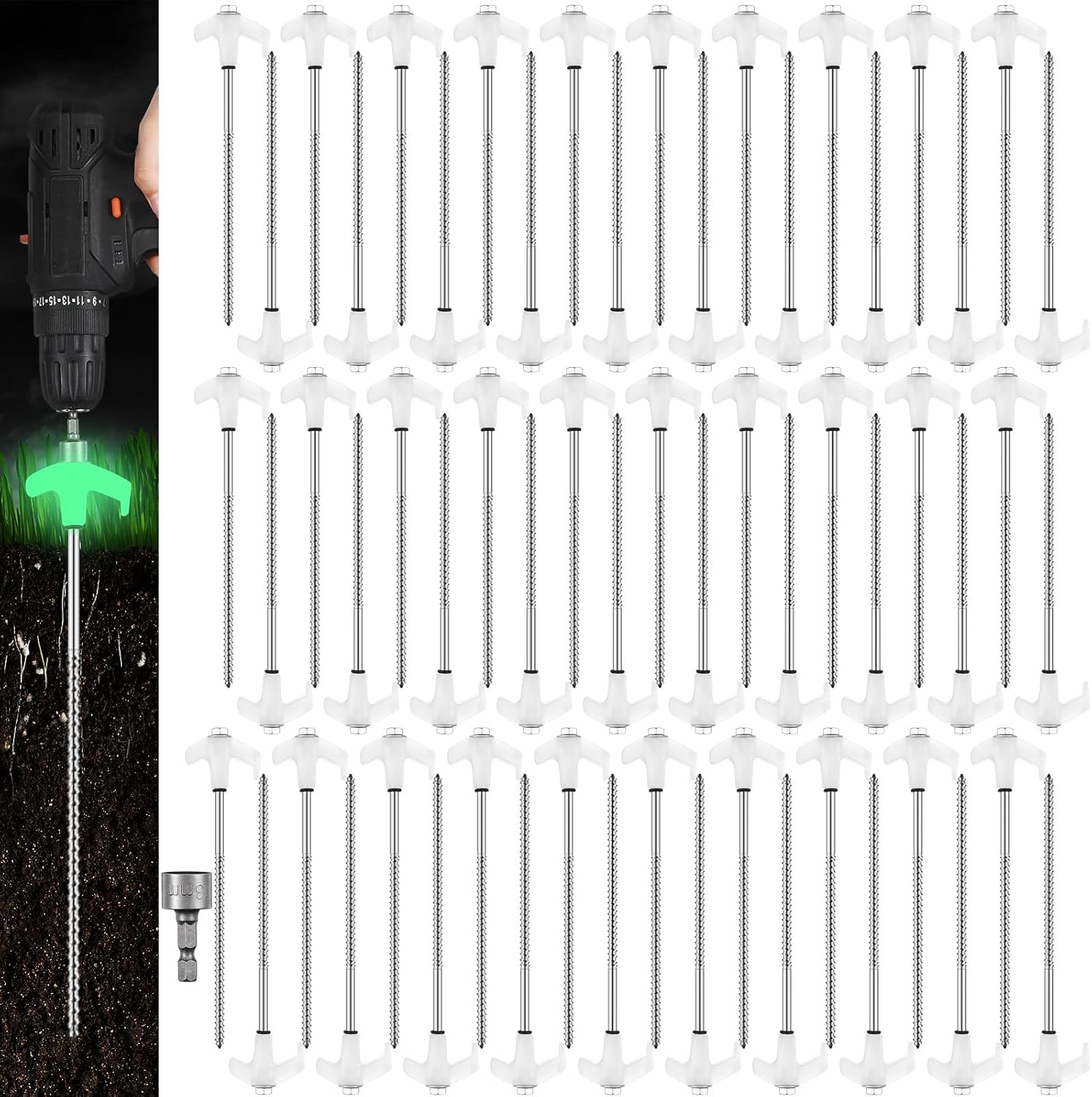 Hicarer 60 Pcs 20 Pcs 8'' Screw in Tent Stakes Heavy Duty Ground Metal Stakes for Inflatables with Hex Head Driver for Outdoor Camping Tent Inflatable Garden Decor (Luminous White)