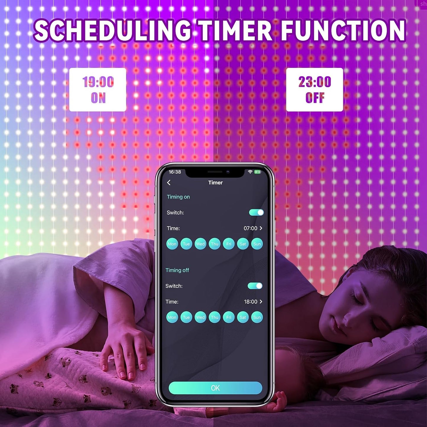 - Series Connection and Timer: Connect up to 3 sets of smart curtain lights through the app to create a larger light screen that can be controlled simultaneously, perfect for covering a wider area; The built-in timer lets you schedule the lights to turn on and off automatically, just like setting an alarm clock, offering hands-free convenience