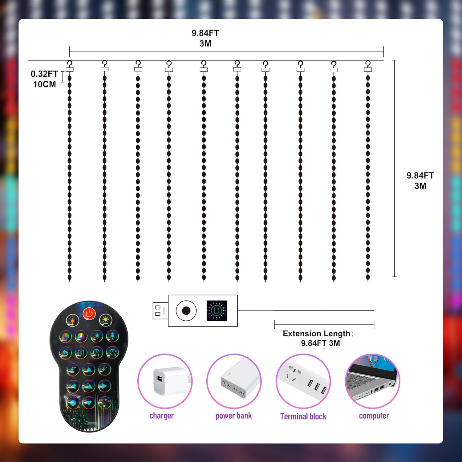 - Smart Curtain Lights: 6.6 x 6.6Ft, 400LEDs USB Powered smart curtains lights come with 10ft long power cord; 6.6ft main strand and 20 drop strings with hooks; Easily control the lights in the room with just a few taps on your phone or remote; Waterproof and ideal for bedrooms, living rooms, gaming rooms, garages, banquet halls, cafes, exterior walls, and windows.