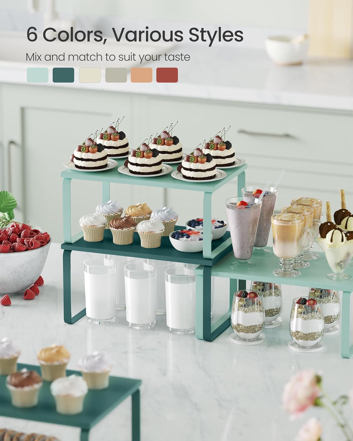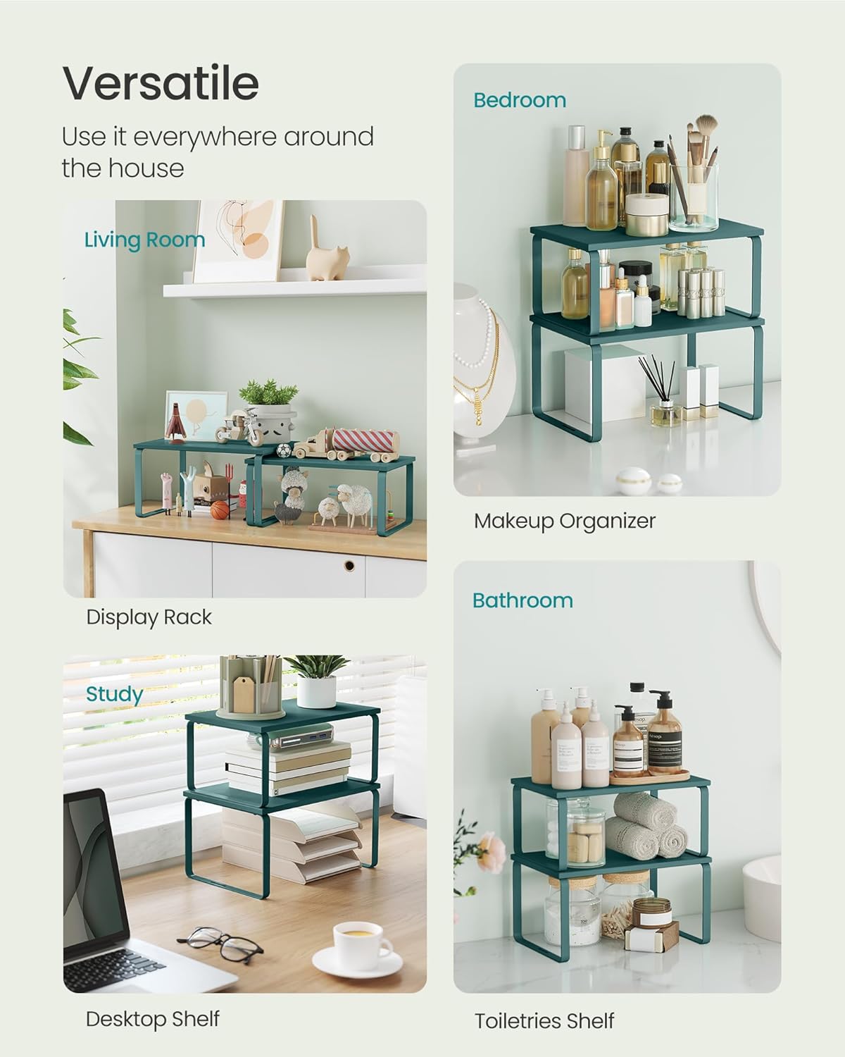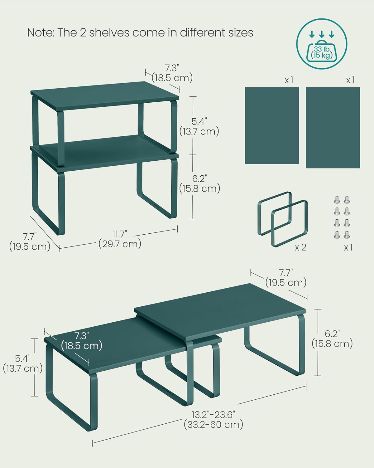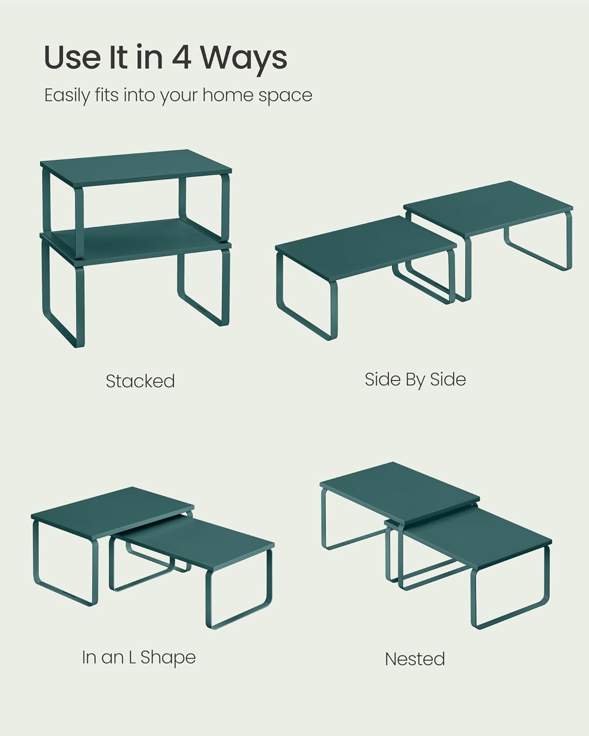 SONGMICS Cabinet Organizer Shelf, Set of 2 Kitchen Counter Shelves, Kitchen Storage, Spice Rack, Stackable, Expandable, Metal and Engineered Wood, Marrs Green UKCS002C02