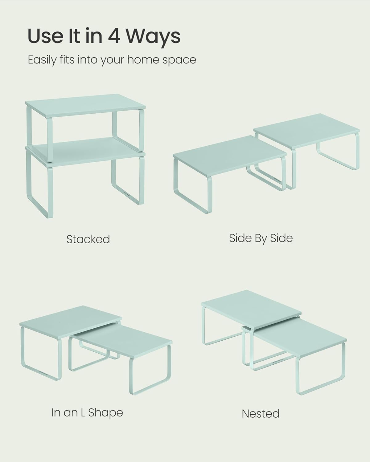 - [Adjustable] With their unique design, with one slightly smaller than the other, these shelf organizers can be stacked on top of one another, nested, used separately, or even in an L-shape. Adjust them how you want to perfectly fit your kitchen space