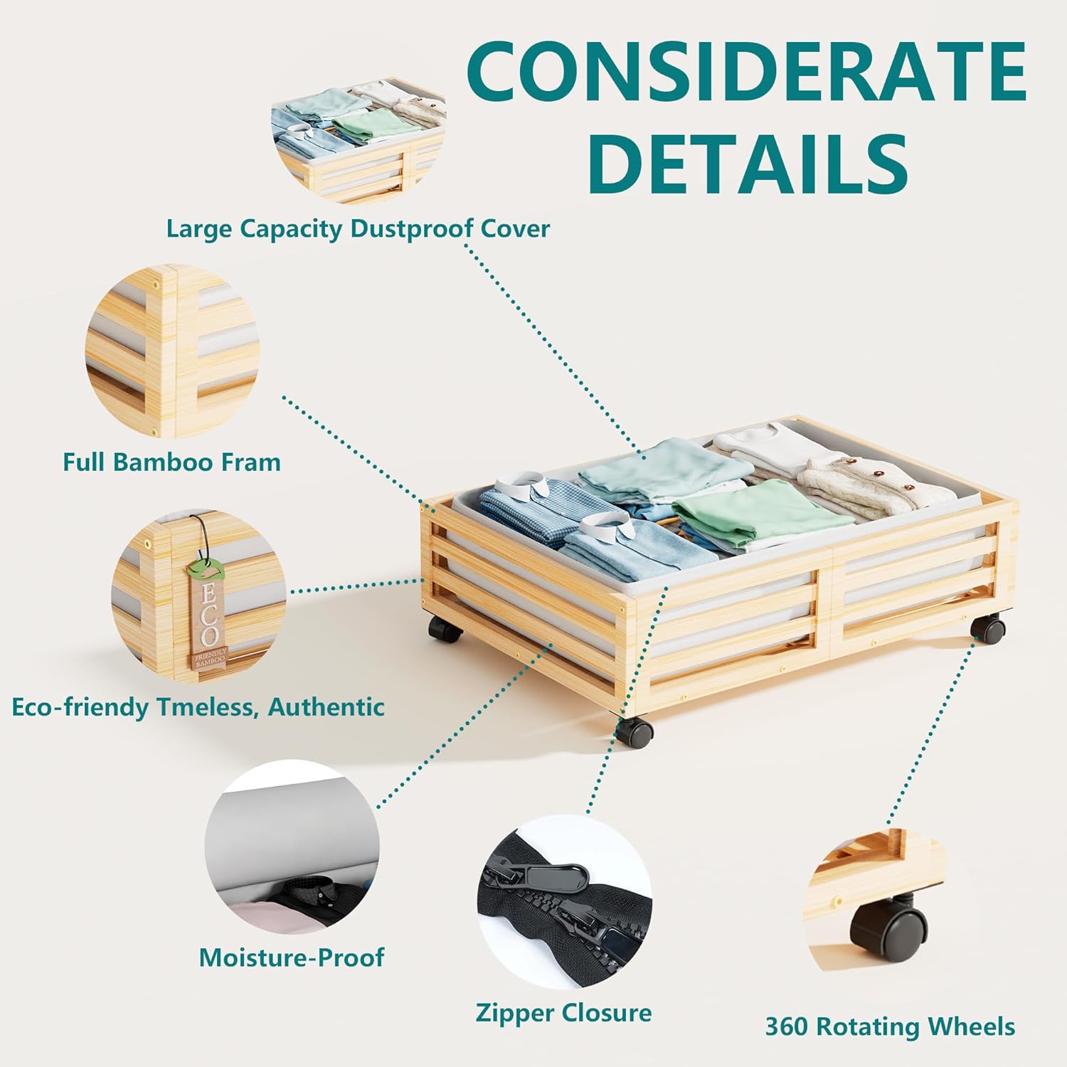 - ๐[Sturdy and Durable] Our under bed storage with wheels is crafted from premium wood bamboo, boasting 4 rotating wheels and a capacity of 120lbs. This 'under bed storage' solution includes non-woven bags for efficient organization of clothes, books, shoes, and toys.