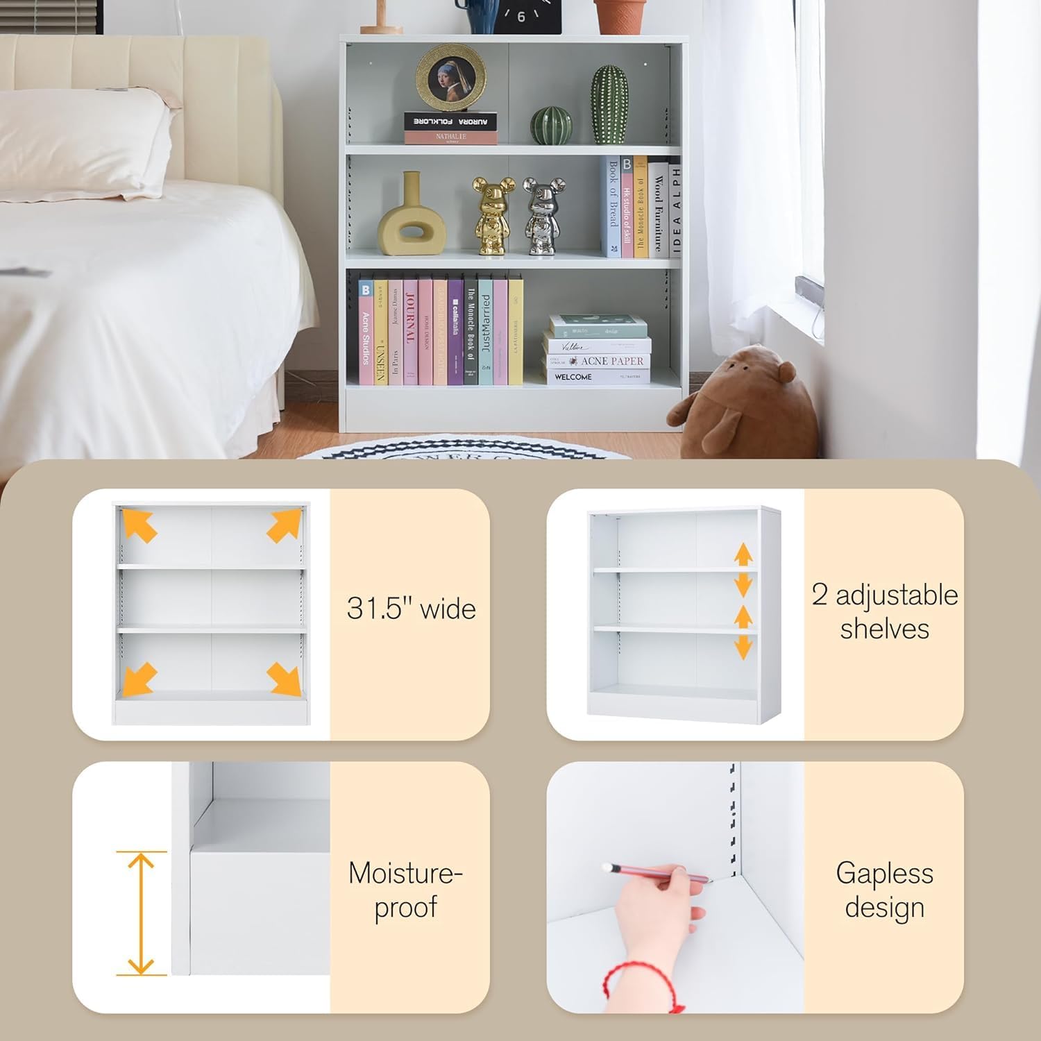 - Bookcase with Adjustable Shelves:3 tier bookcases white with 2 flexible shelves,which can be removed or adjusted to suit the needs of storing large-sized items.Freestanding utility cabinet with a lot of storage space for home office storage in living room/kitchen/study room/bathroom and more.