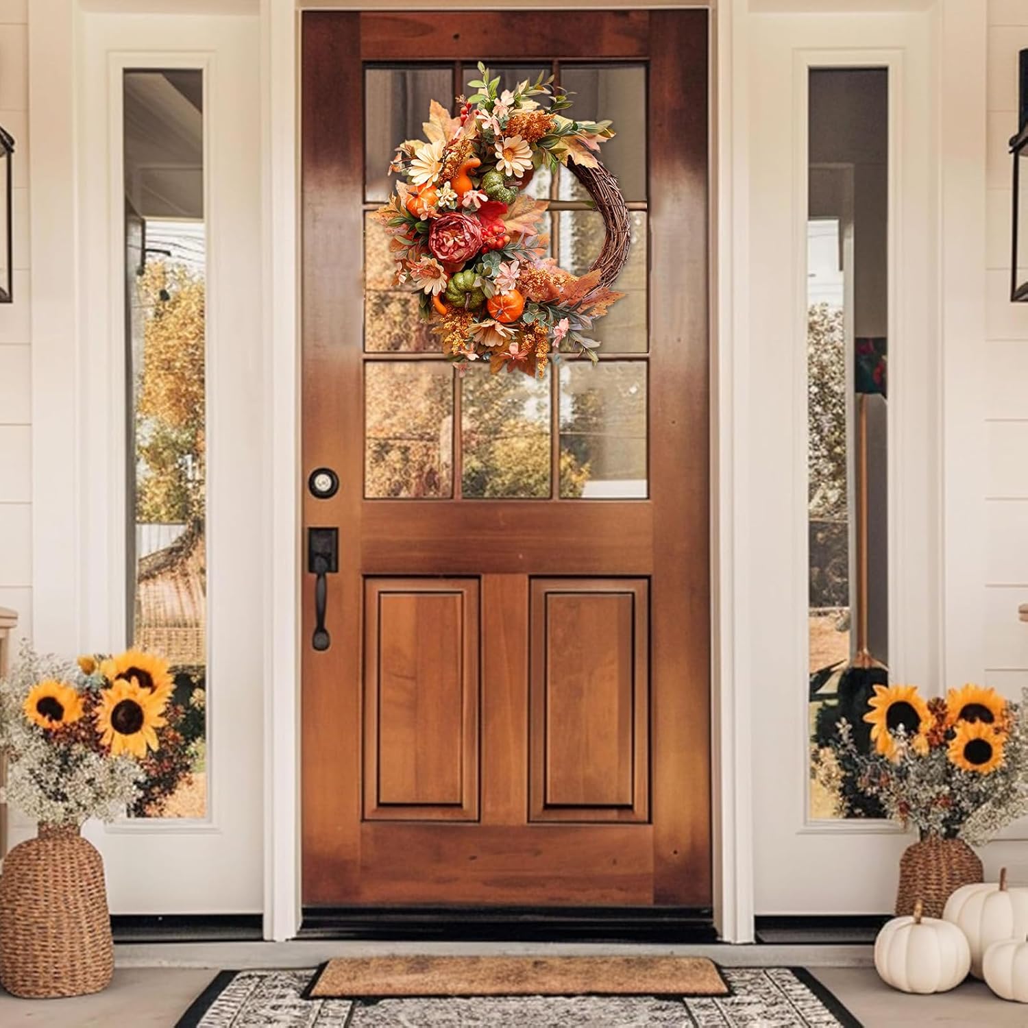 - 【Fall Wreath】- Our fall wreath for front door is handcrafted which is made of colorful pumpkins, peony, sunflowers and maples leaves .The fall floral wreaths is made of artificial silk flowers not plastic,which looks more realistic and bright.