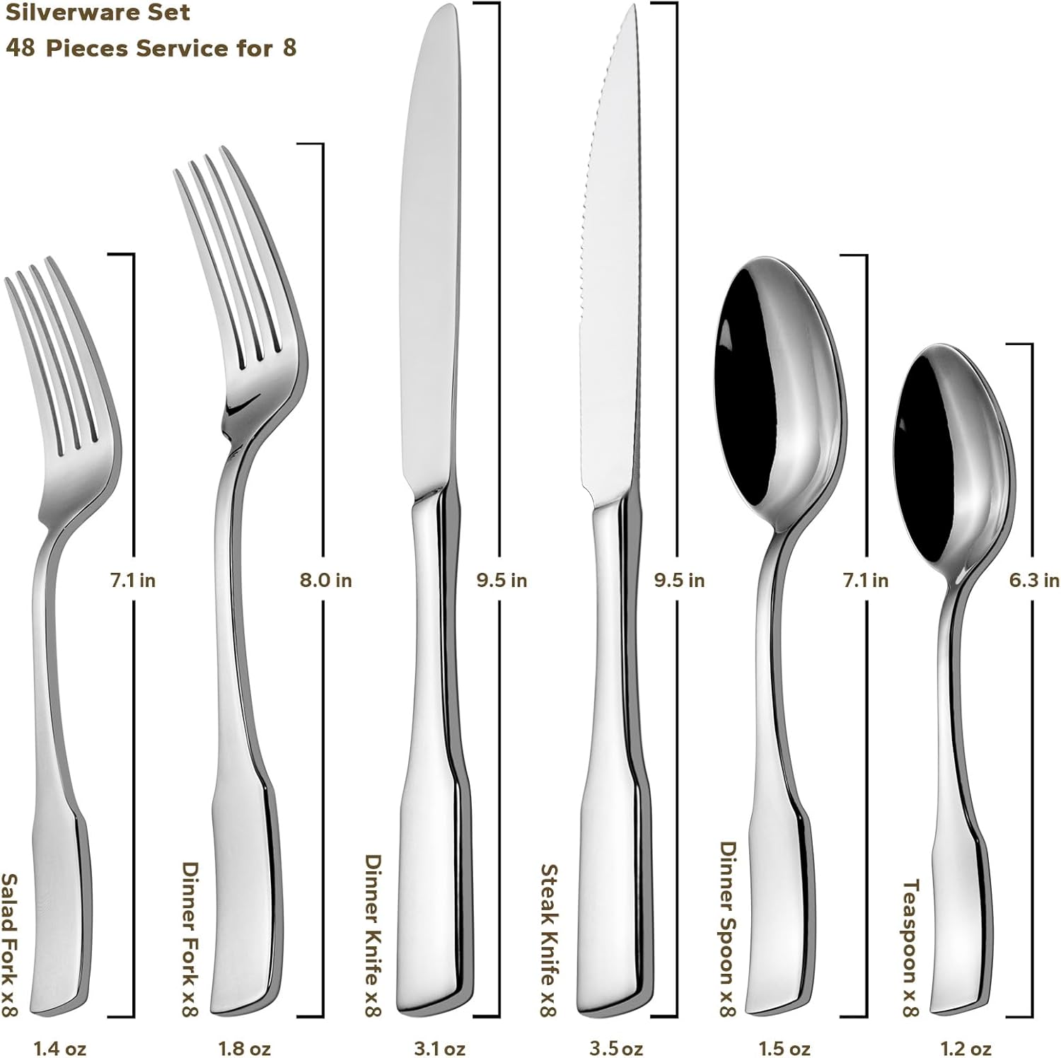 - INCLUDES: 48-piece flatware set with service for 8. Includes 8 each: dinner knife, steak knife, dinner fork, salad fork, dinner spoon and teaspoon