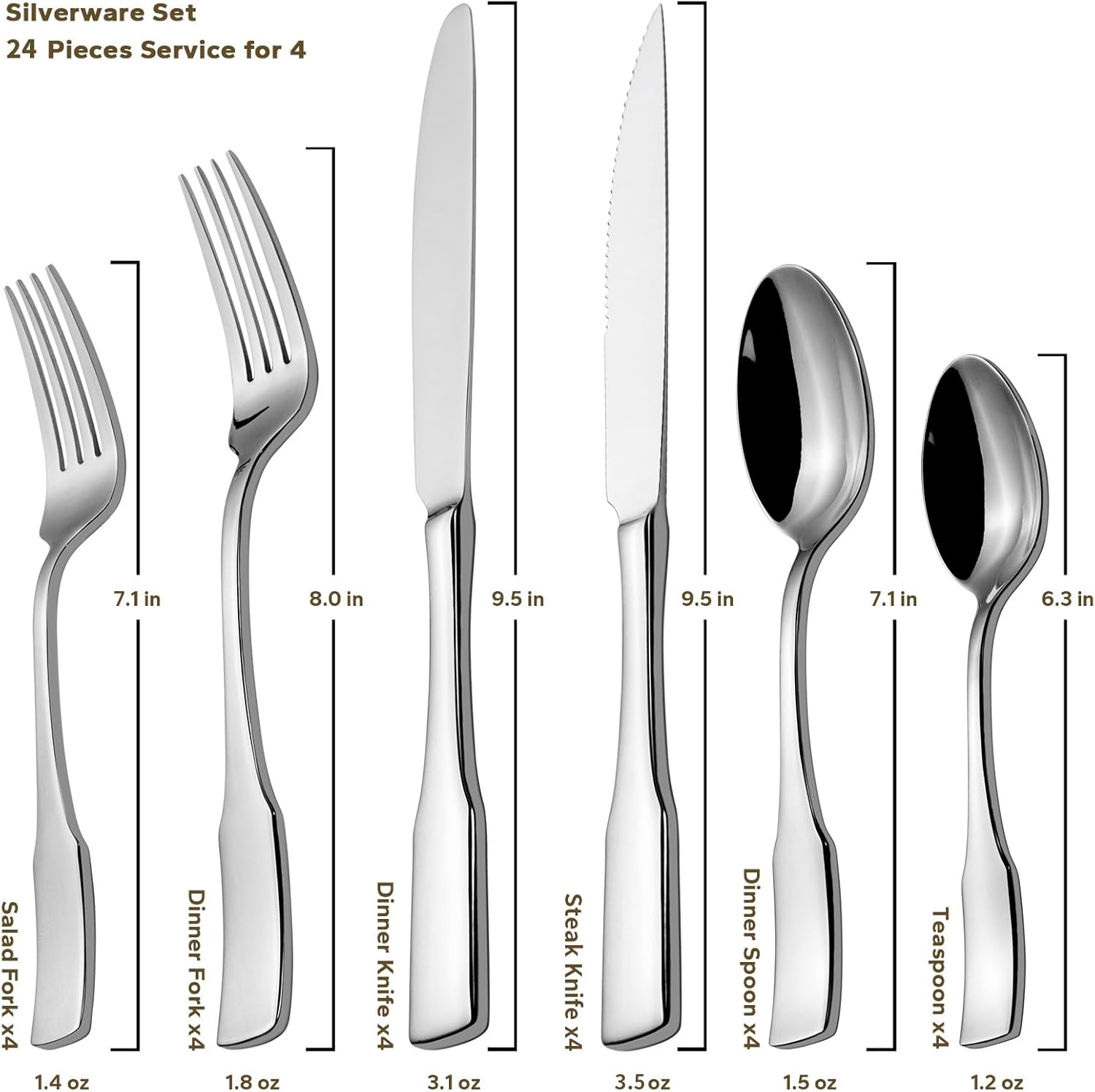 Alata Kate 24-Piece Silverware Set with Steak Knife, Stainless Steel Flatware Set Service for 4, Mirror Polished Cutlery Set Dishwasher Safe