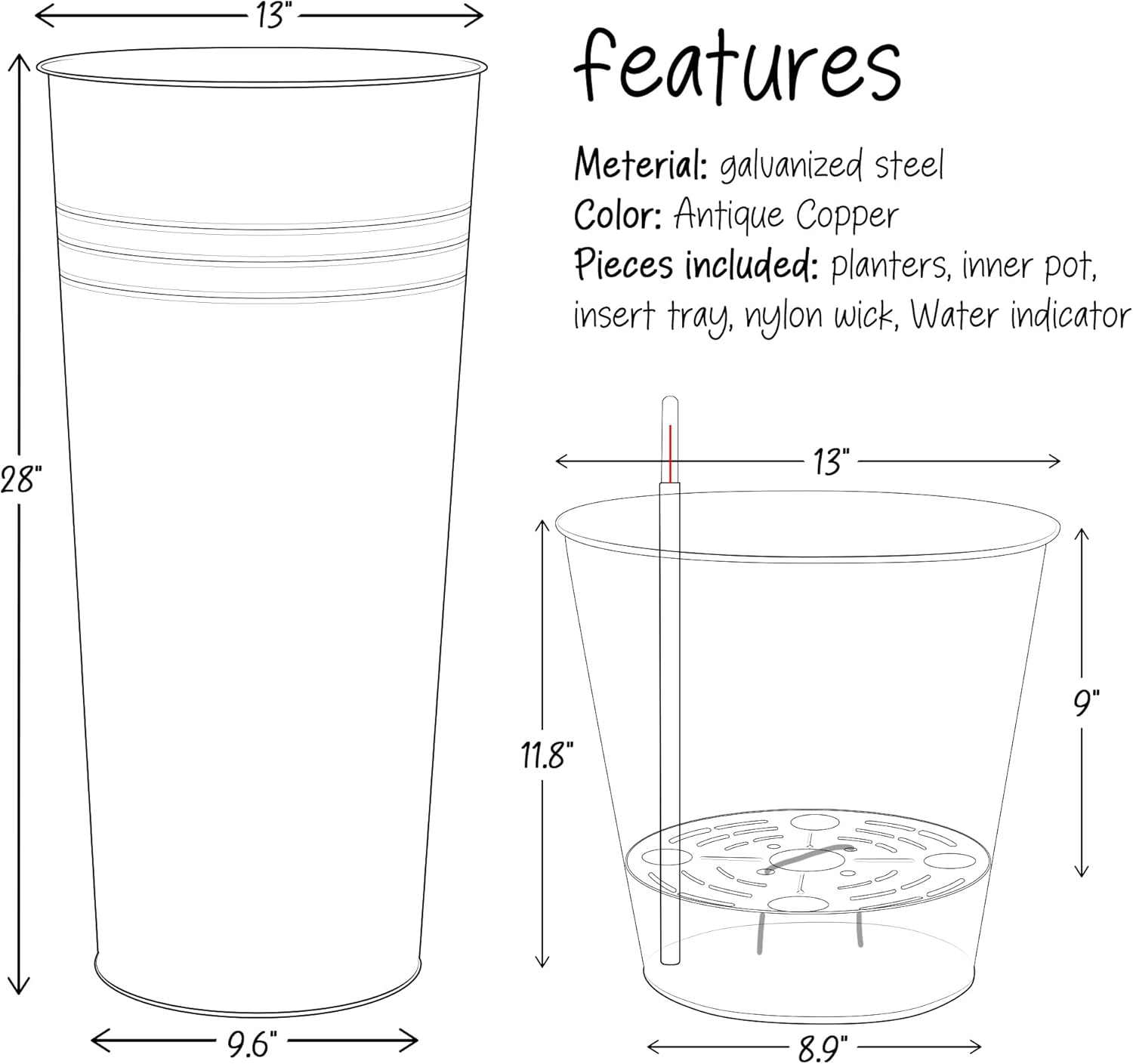 - INSERT POTS: Package includes 2 large planters and each planter comes with a steel insert pot to reduce the amount of soil needed to fill the containers. Each insert has a drainage plate to ensure that the plant roots have sufficient ventilation and respiration. And each insert has a cotton absorbent rope, which can prevent plant roots from rotting by absorbing excess water