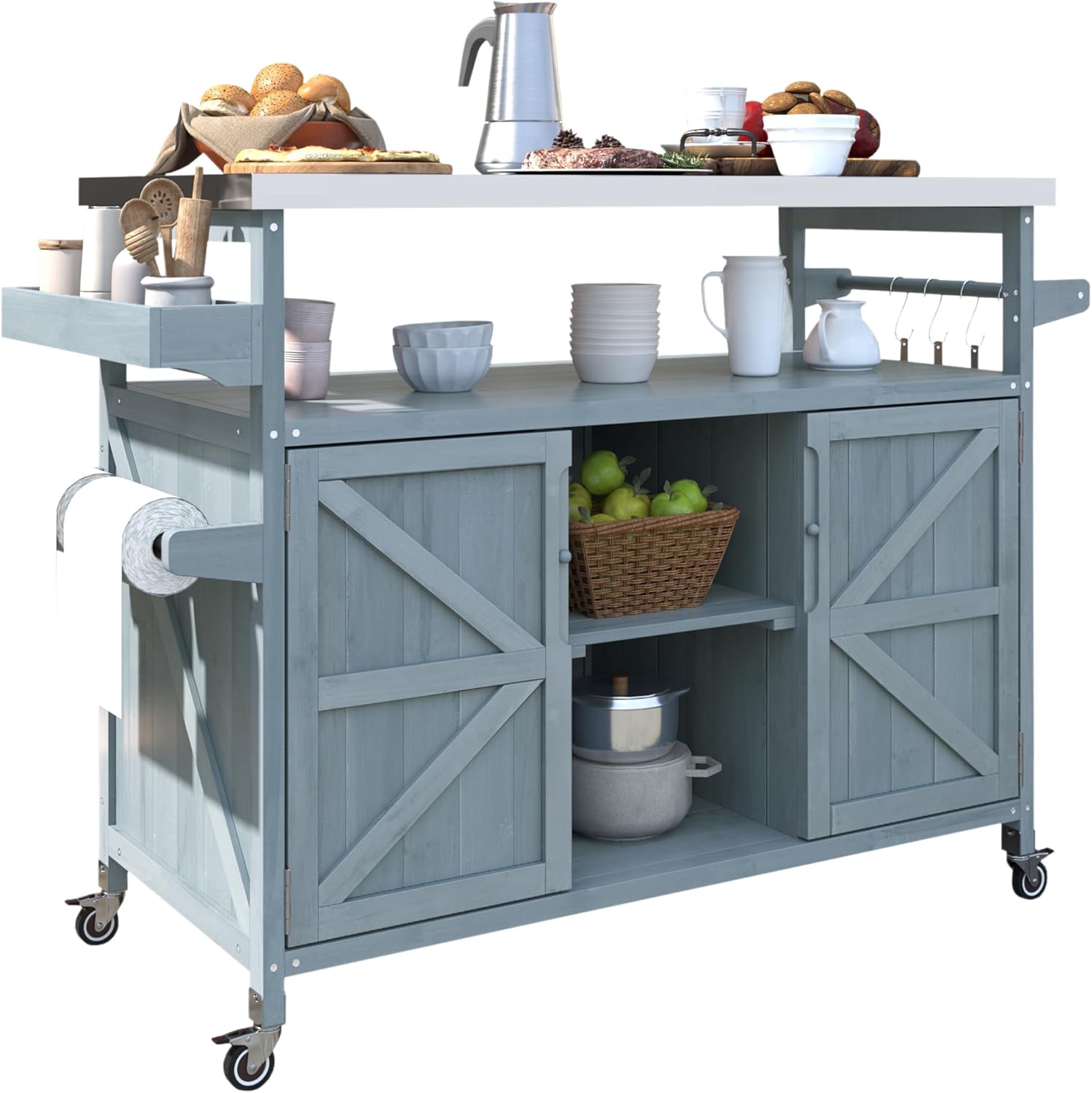 Outdoor Solid Wood Grill Table with Stainless Steel Top, Farmhouse Kitchen Island with Storage Cabinet, Outdoor Bar Cart with Internal Storage Rack, Spice & Towel Rack, Grey Blue