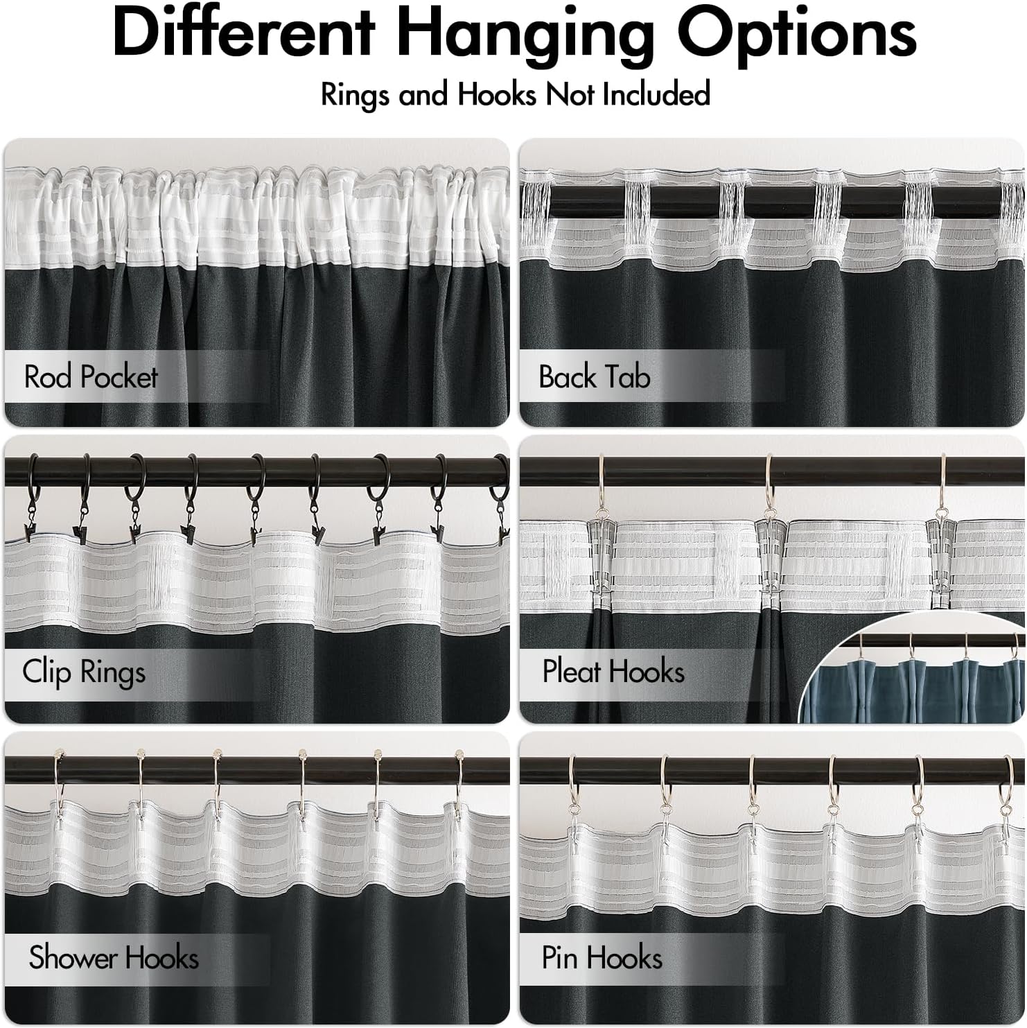 - HANGING OPTIONS: Each curtain panel has 3-in-1 top style design: rod pocket, back tab and pinch pleat. Back loop (2.3 inch) and rod pocket (3.1 inch) fit most standard rod. Curtains also can be hung with clip rings or curtain hooks. 3 ways to meet your various needs.