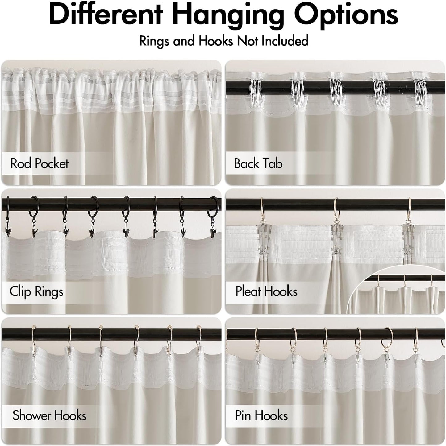 - HANGING OPTIONS: Each curtain panel has 3-in-1 top style design: rod pocket, back tab and pinch pleat. Back loop (2.3 inch) and rod pocket (3.1 inch) fit most standard rod. Curtains also can be hung with clip rings or curtain hooks. 3 ways to meet your various needs.