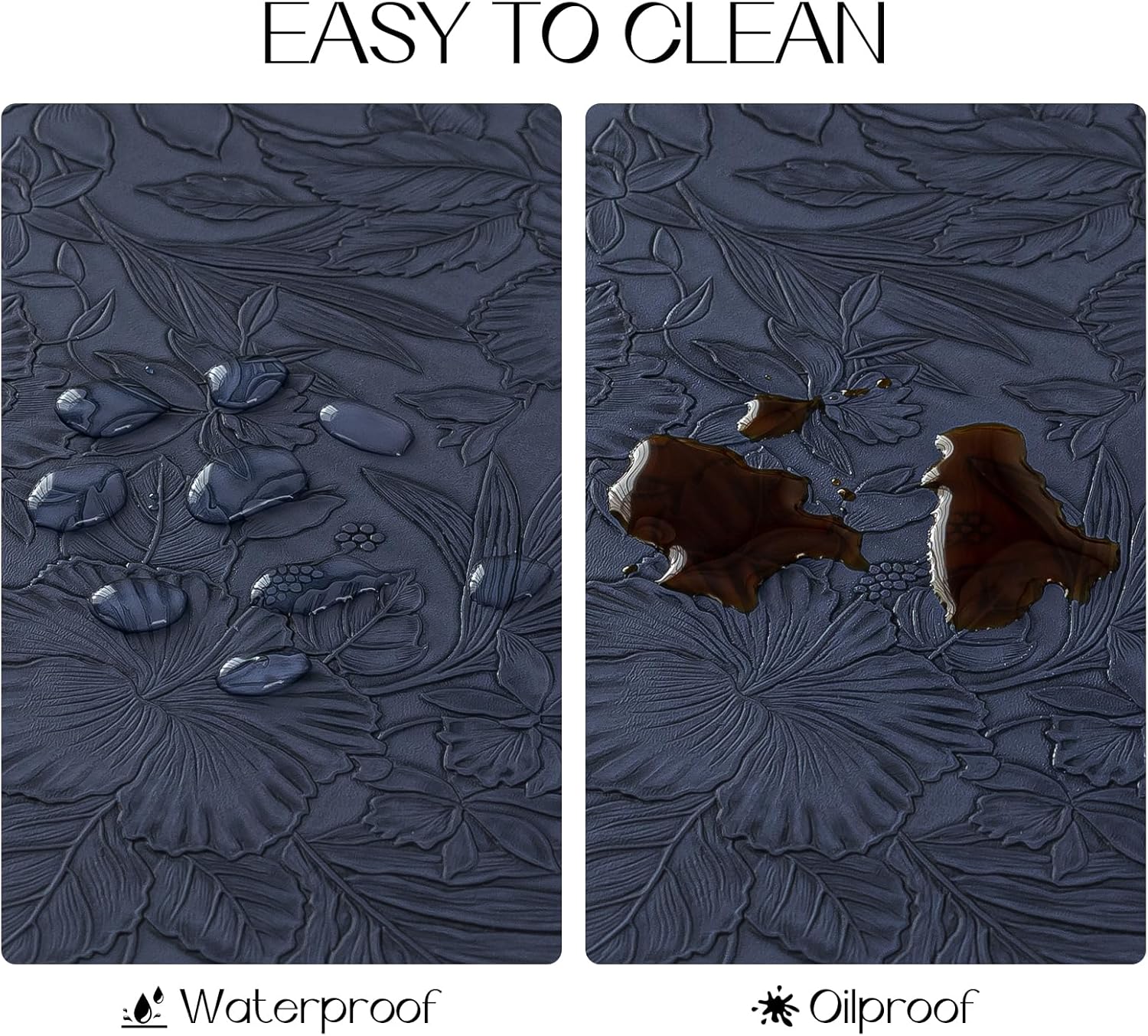 Romanstile Vinyl Placemats Set of 8-12 X 18 Inch - Heat Resistant Non-Slip Embossed Floral Place Mats 100% Waterproof Oilproof Wipeable Faux Leather Table Mats for Kitchen/Dining/Party, Navy Blue