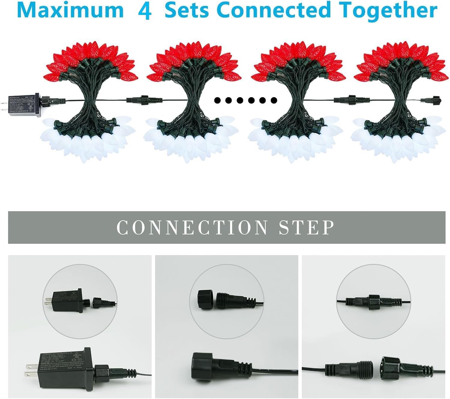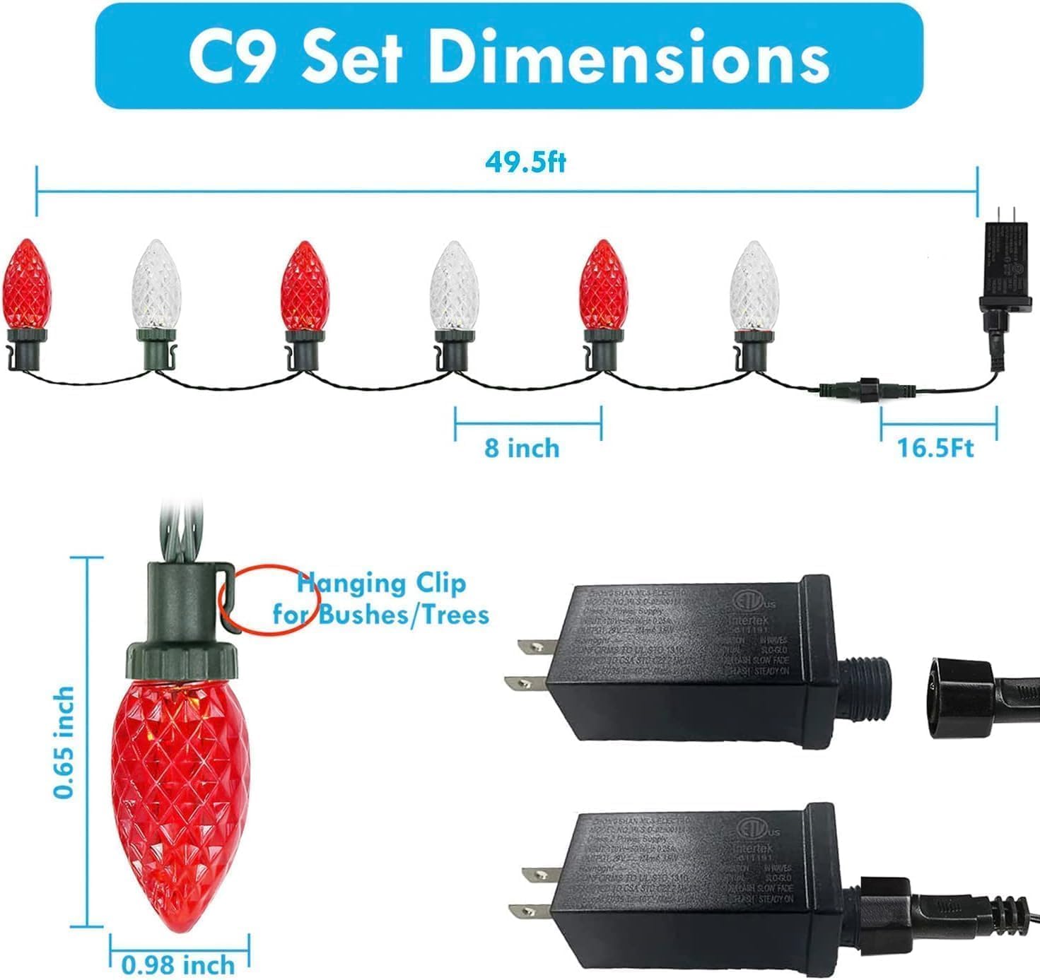 - C9 Led Christmas Lights for Outdoor & Indoor: Total length is 49ft, of which 33ft with lights. Super bright with new upgraded LED chips. These waterproof C9 Christmas string lights have red and white 50 LED bulbs to satisfy your diverse decorative effect.
