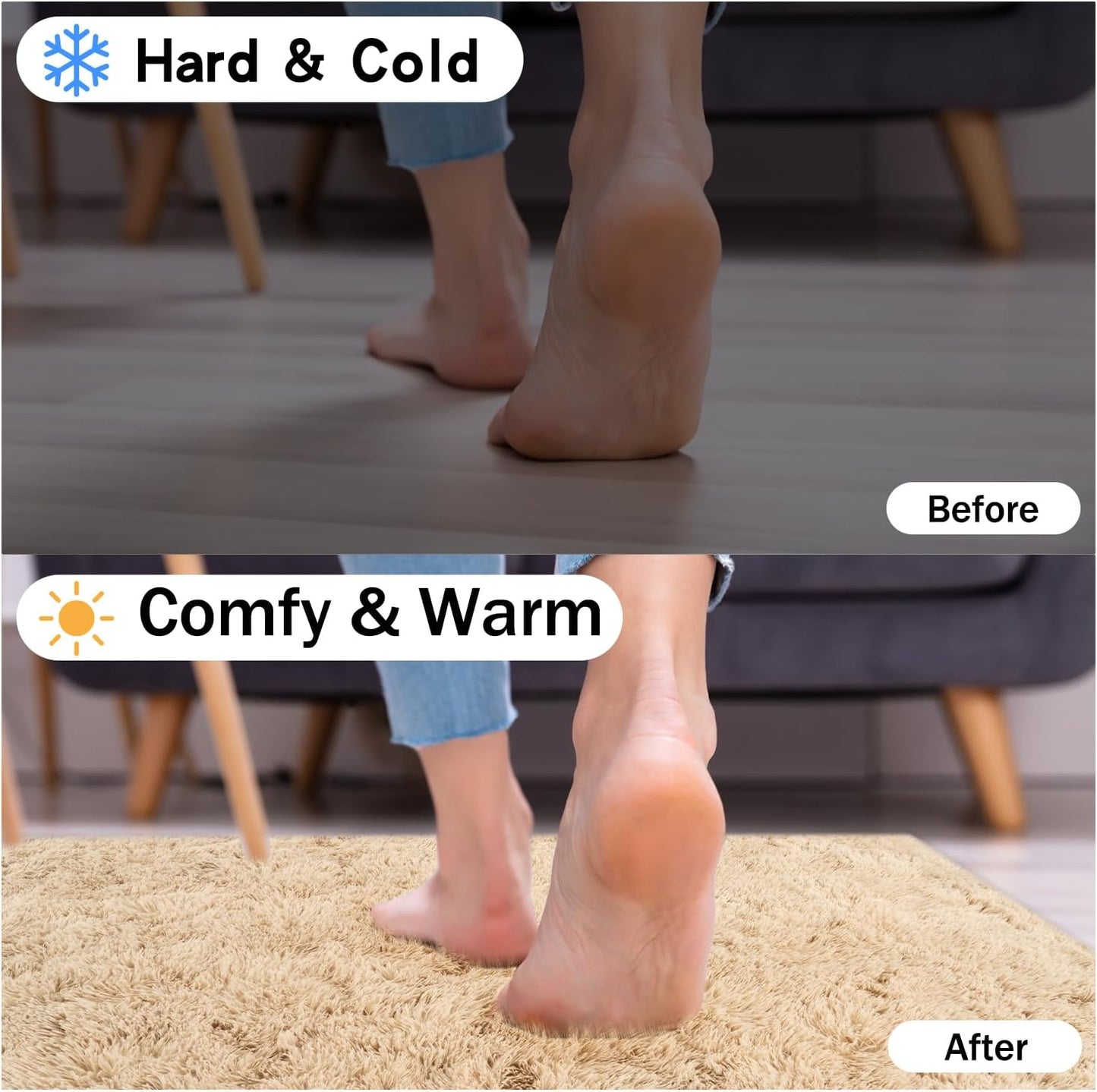 - Rezutan Area Rugs-Soft Fluffy Rug:The Rezutan shag area rug is crafted from durable microfiber, ensuring a plush and incredibly comfortable experience. Its 1.7-inch high pile surface is dense and velvety to the touch, while the 0.3-inch memory foam provides superior cushioning, isolating you from the cold ground and offering soundproofing benefits. Because of the plush fur on the Soft Fluffy rug, you’ll feel like walking on the clouds when walking barefoot on the large bedroom rugs.