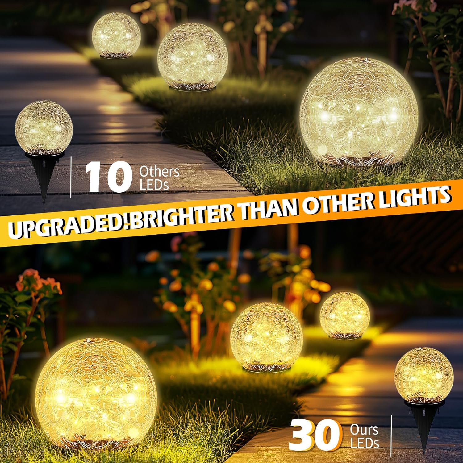 - Premium Material: The solar garden lights are made of thick crackle glass globe, cracked glass is like a beautiful crystal ball. It adopts high quality LED lamp beads, built-in LED copper wire lamp, has a soft and warm light, the bulbs shine like many little stars so warm and so bright, creating a romantic and relaxing atmosphere, bringing you a fairy-tale garden.