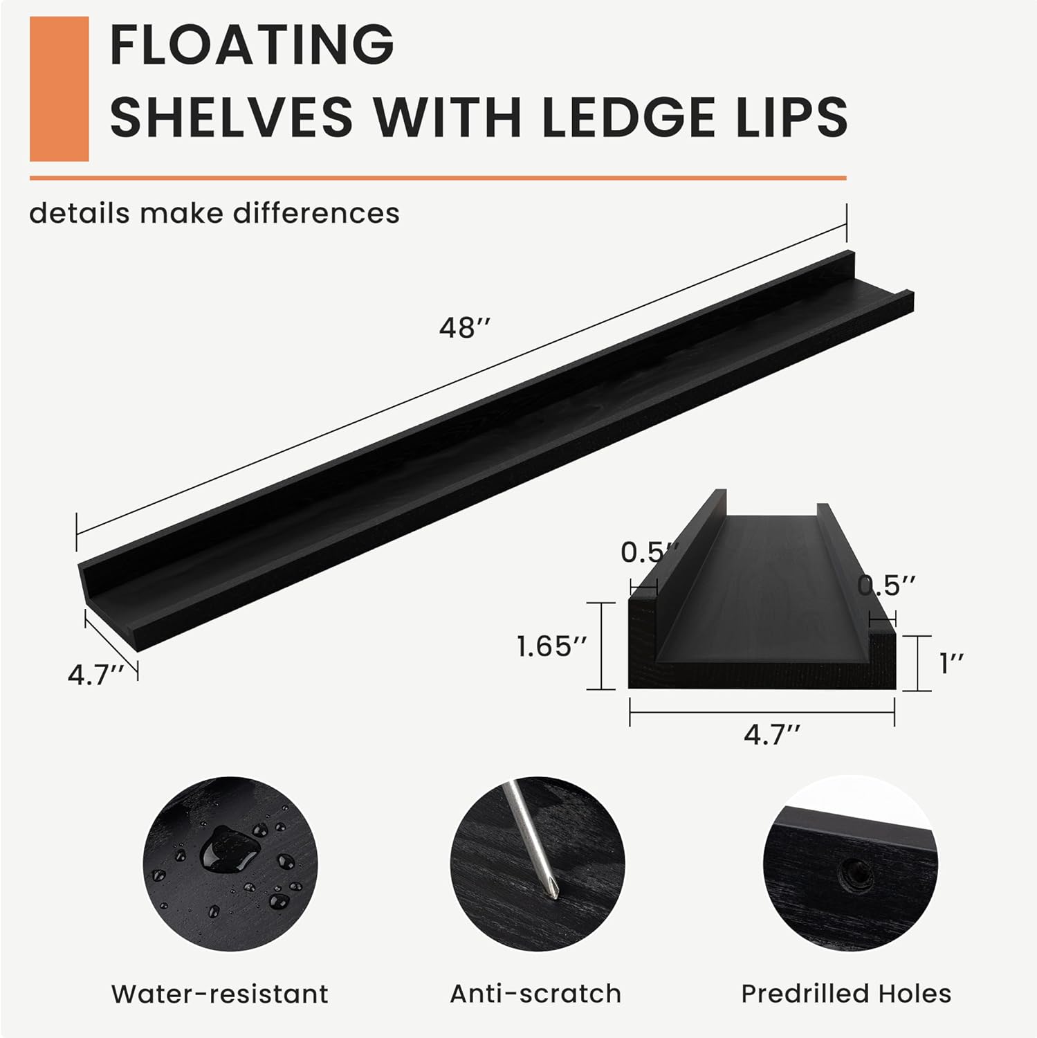 Solid Ash Wood Floating Shelves, Wood Picture Ledge Shelf Set of 2, 48 Inch Long Large Photo Ledge Shelves, Nursery Book Shelves Wall Mounted for Living Room Kids' Bedroom Decor, Black