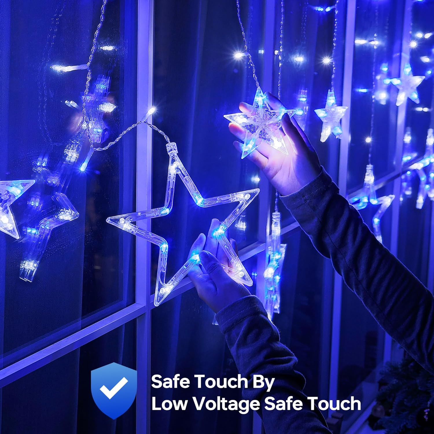 - Blue and white Christmas icicle lights with star:MYGOTO 126 bright blue and white LED Christmas curtain Lights with pure copper transparent wire is 8.2 feet long.12 Stars (6 large +6 small), the diameter of the large star is 7.3inch,the small star is 3.5inch. Hanging them from a house, or from a fence create a winter wonderland that attracts Santa and fairies,bring you a lot of festive atmosphere.