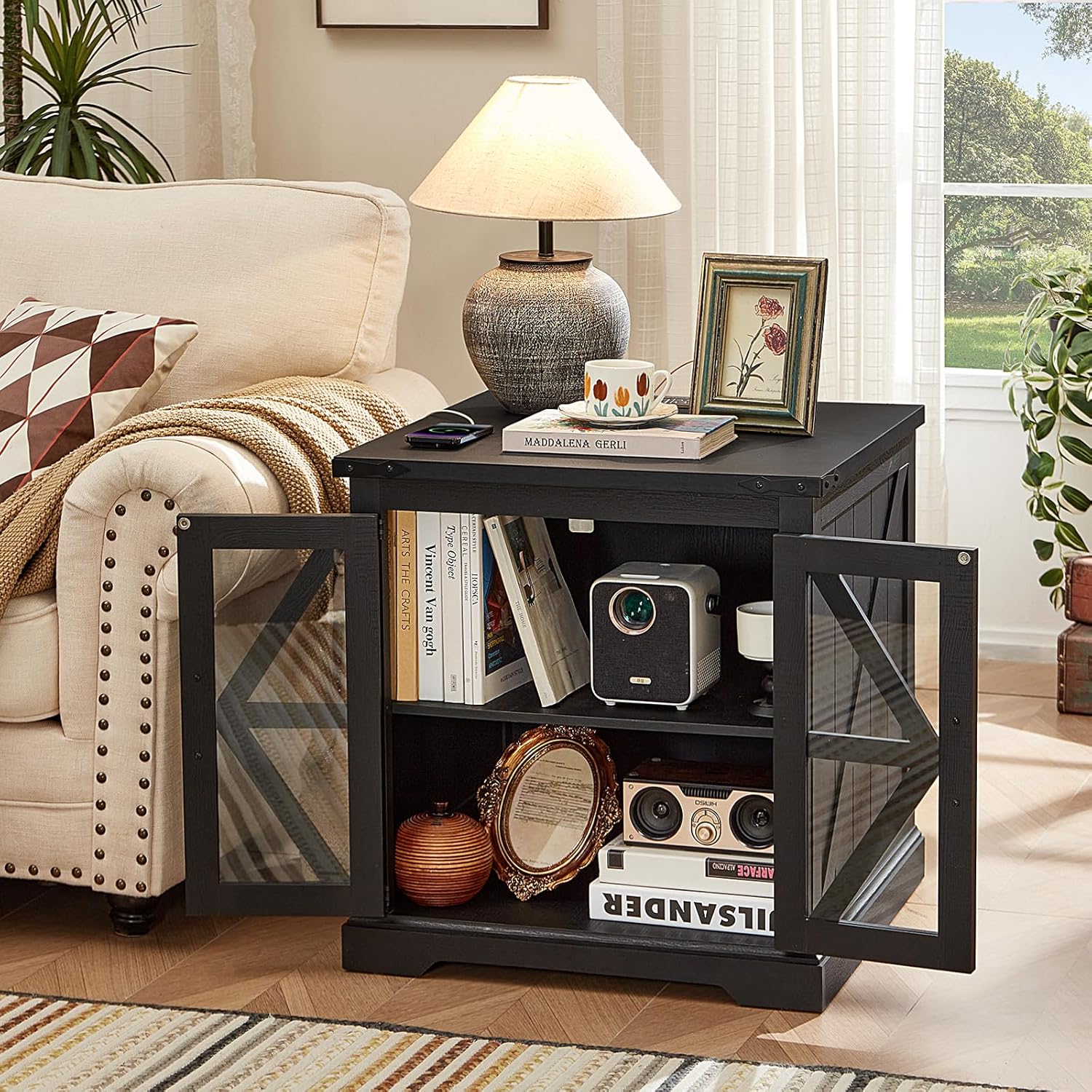 - ๐ก[Farmhouse-Style end Table with Charging Station]This large end tables with generous storage is a perfect fusion of farmhouse and industrial metal styles. The exquisite barn-style tempered glass doors and the black metal corner accents add an elegant touch to the cabinet body, making it visually captivating from any angle.