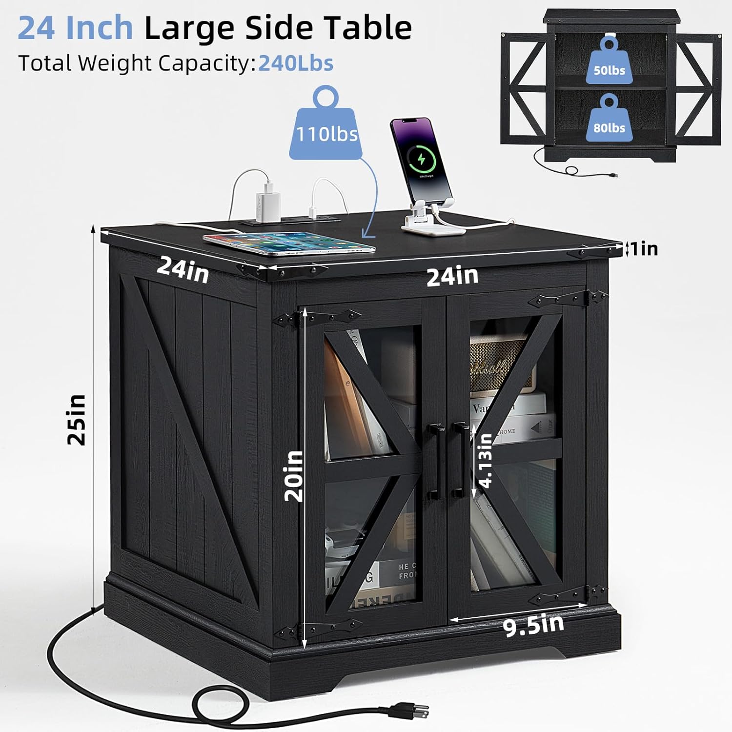 24" End Table with Charging Station, Farmhouse Night Stand with Glass Barn Door, Black Nightstands with Adjustable Storage Shelf, Large Wood Square Bed Side Table for Living Room,Bedroom