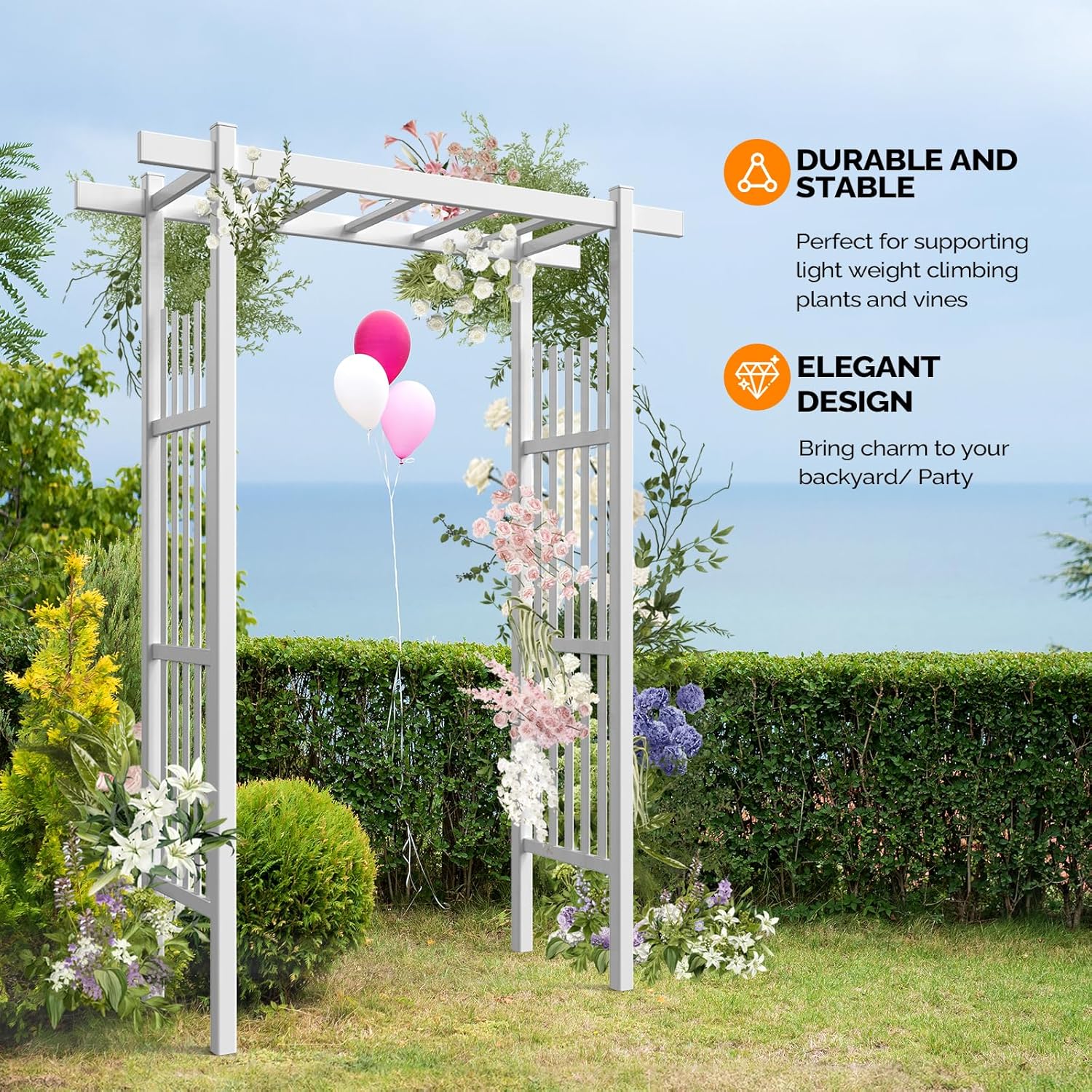 - Elegant Arch: Elegant white is suitable for weddings, classy parties and just about any occasion. Whether standing alone or covered with climbing vines and flowers, these outdoor arch add a striking focal point to your event. Adding grace and prominence to any outdoor venue with the Arbor features squared lattice side panels