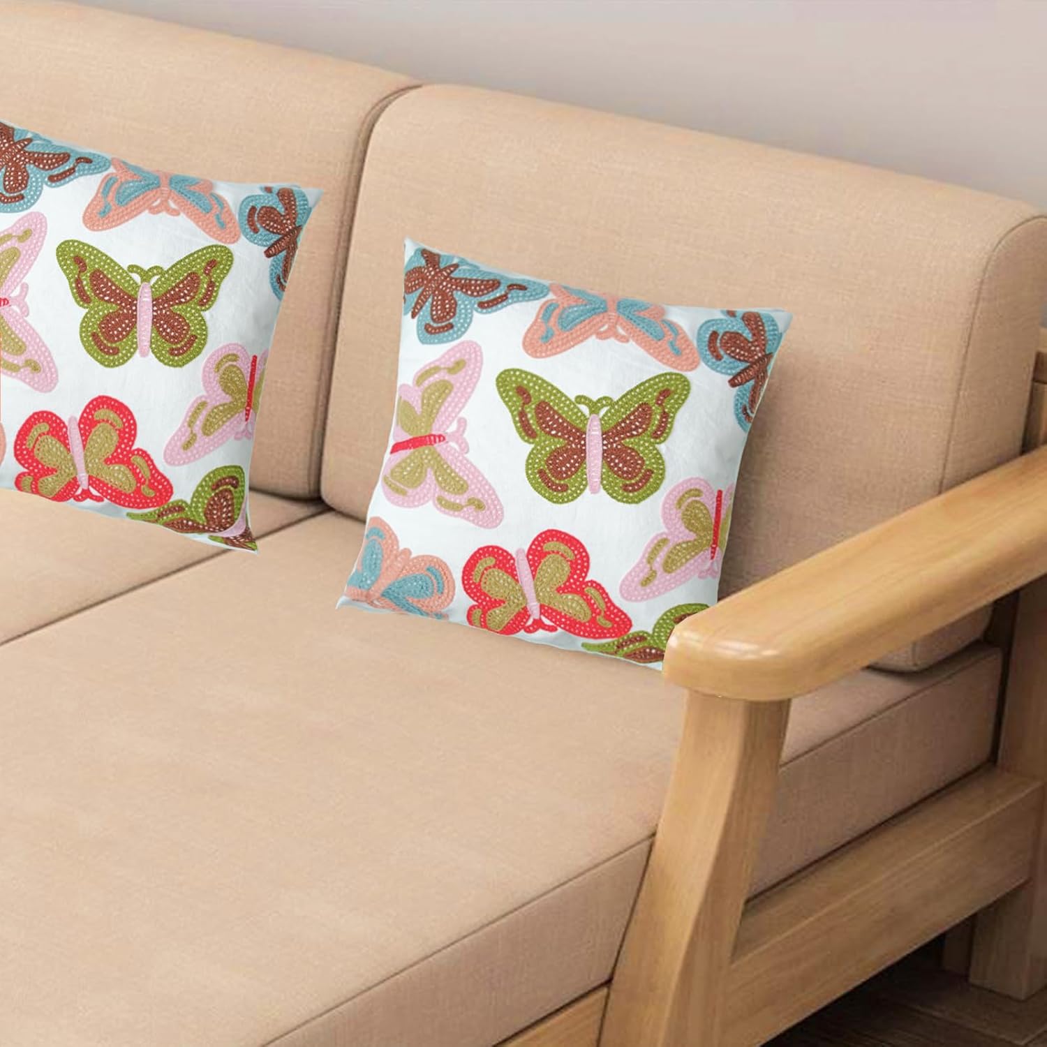 Embroidered Decorative Throw Pillow Cover, 18"x18" Set of 2, Farmhouse Pillowcase Colorful Butterfly Knit Pattern Cotton Canvas Cushion Case Square Floral Pillow Case for Sofa Couch Bed Living Room