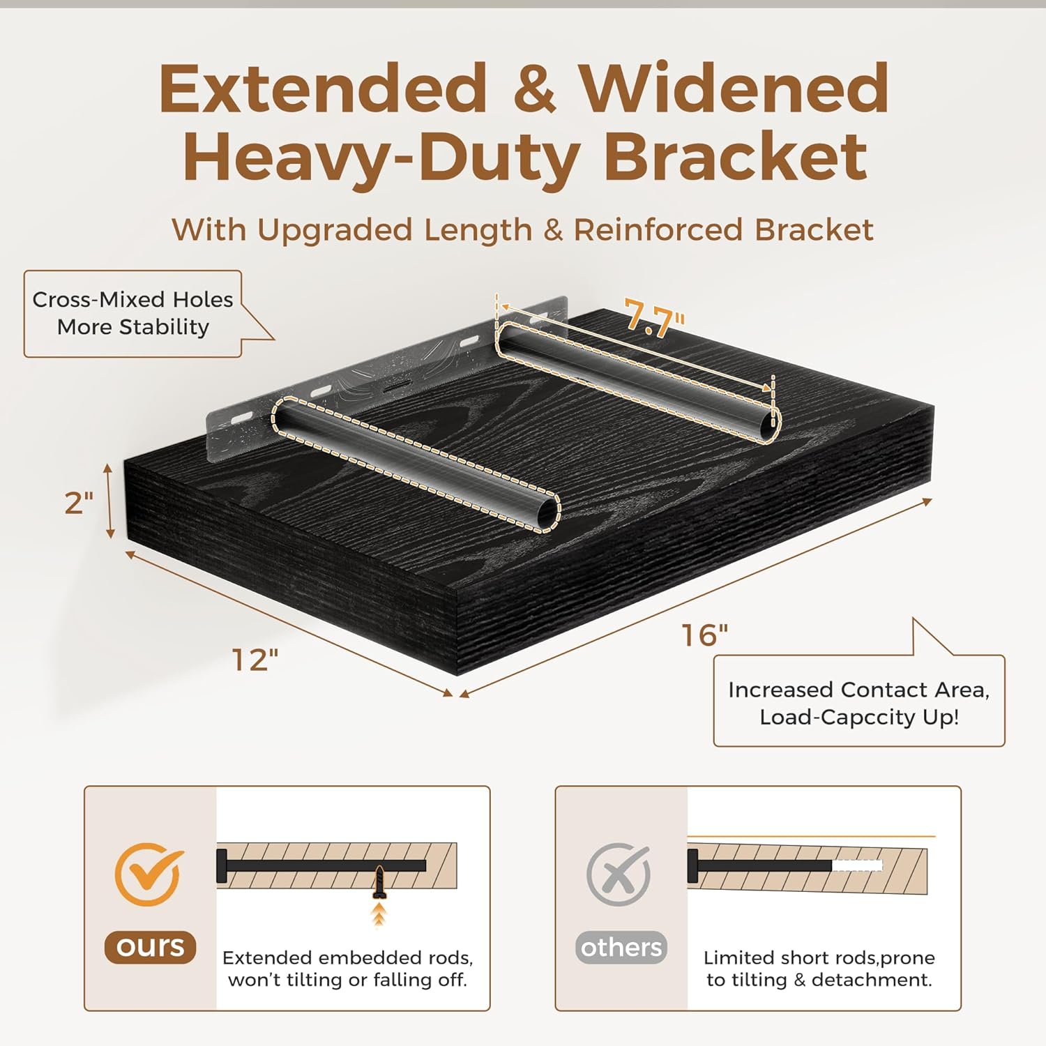 12 Inch Deep Black Floating Shelves, 16 x 12 Floating Shelf for Books, Rustic Wood Deep Wall Shelves for Home Storage & Display, 2" Thicked Shelves for Kitchen, Living Room, Bedroom, 2 Pack