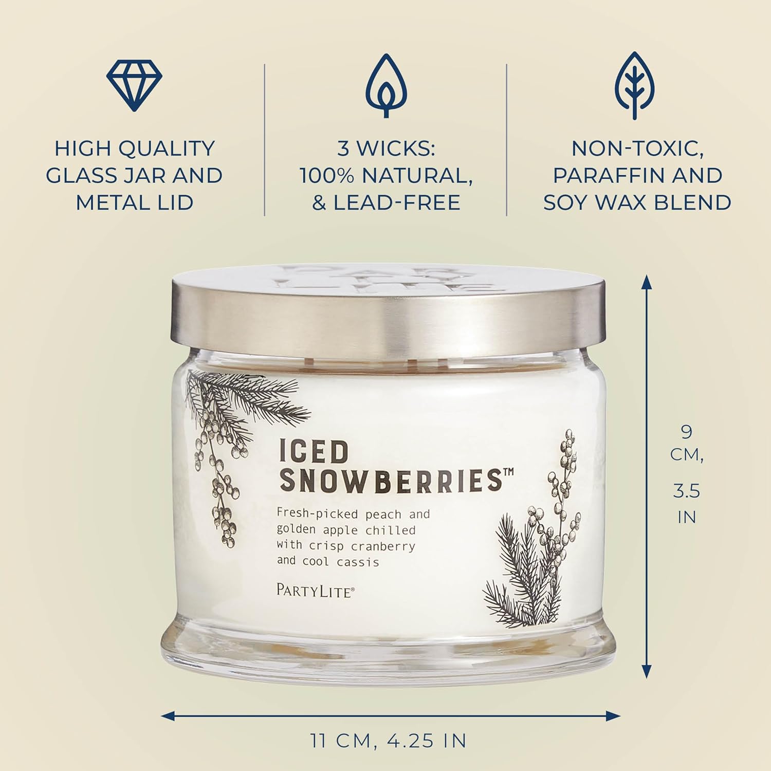 PartyLite Iced Snowberries Scented, Notes of Apple, Cassis, Cranberry, Peach, Strawberry, Berry, Vanilla & Musk,13.2oz 3-Wick Jar Candle, 45 Hour Burn Time, Luxurious Fragrance, Perfect for Gifting
