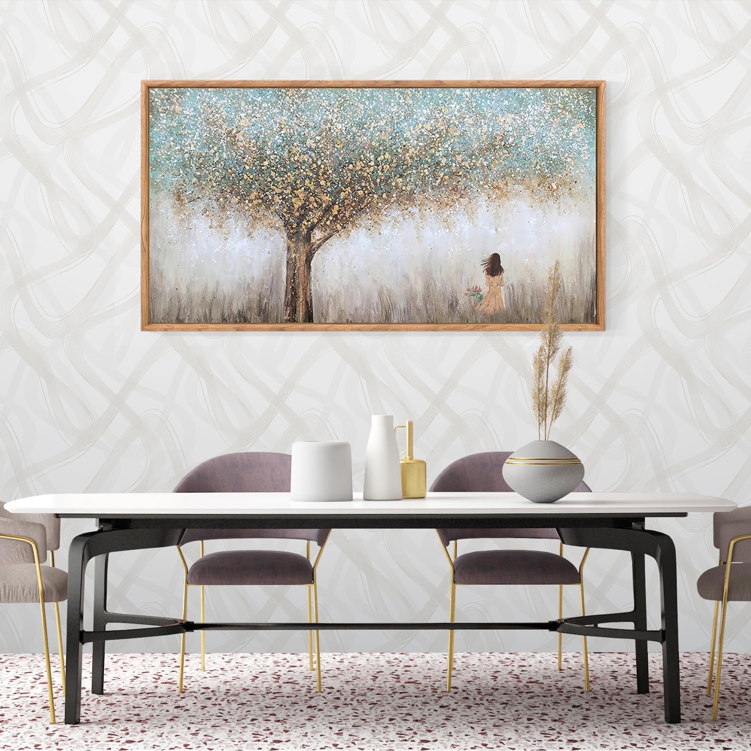 Aurlan Tree of Life Hand Painted Framed Wall Decor(40"x20"), Large Abstract Girl under Tree Oil Painting Canvas Artwork, Modern Nature Landscape Art for Office Living Room Bedroom