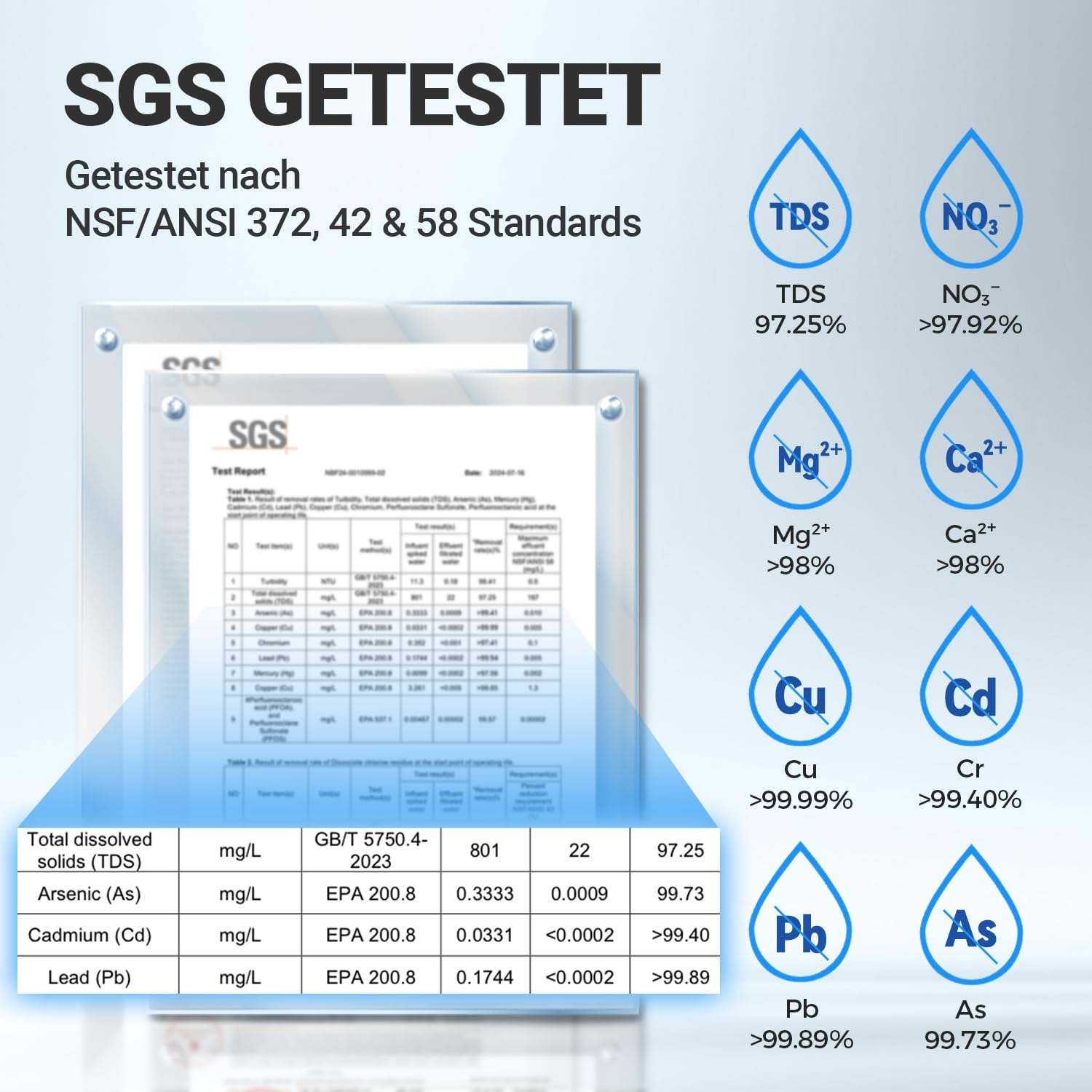 - 8 Stage Filtration: The reverse osmosis system features a 0.0001 μm membrane that effectively filters PFAS, heavy metals like lead, arsenic, and aluminum while the PCT filter enhances taste. This RO system is NSF/ANSI 58 certified for water assurance