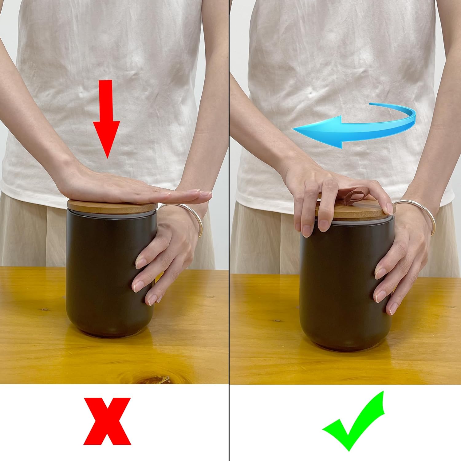 - Easy to Refill & Clean: The wide-mouth design allows for quick scooping, refilling, or cleaning. The ceramic jar is dishwasher safe, while the bamboo lid must be hand washed and dried promptly. Tips; To ensure proper sealing, press the lid downward while twisting it at the same time—do not push it straight down without rotation.
