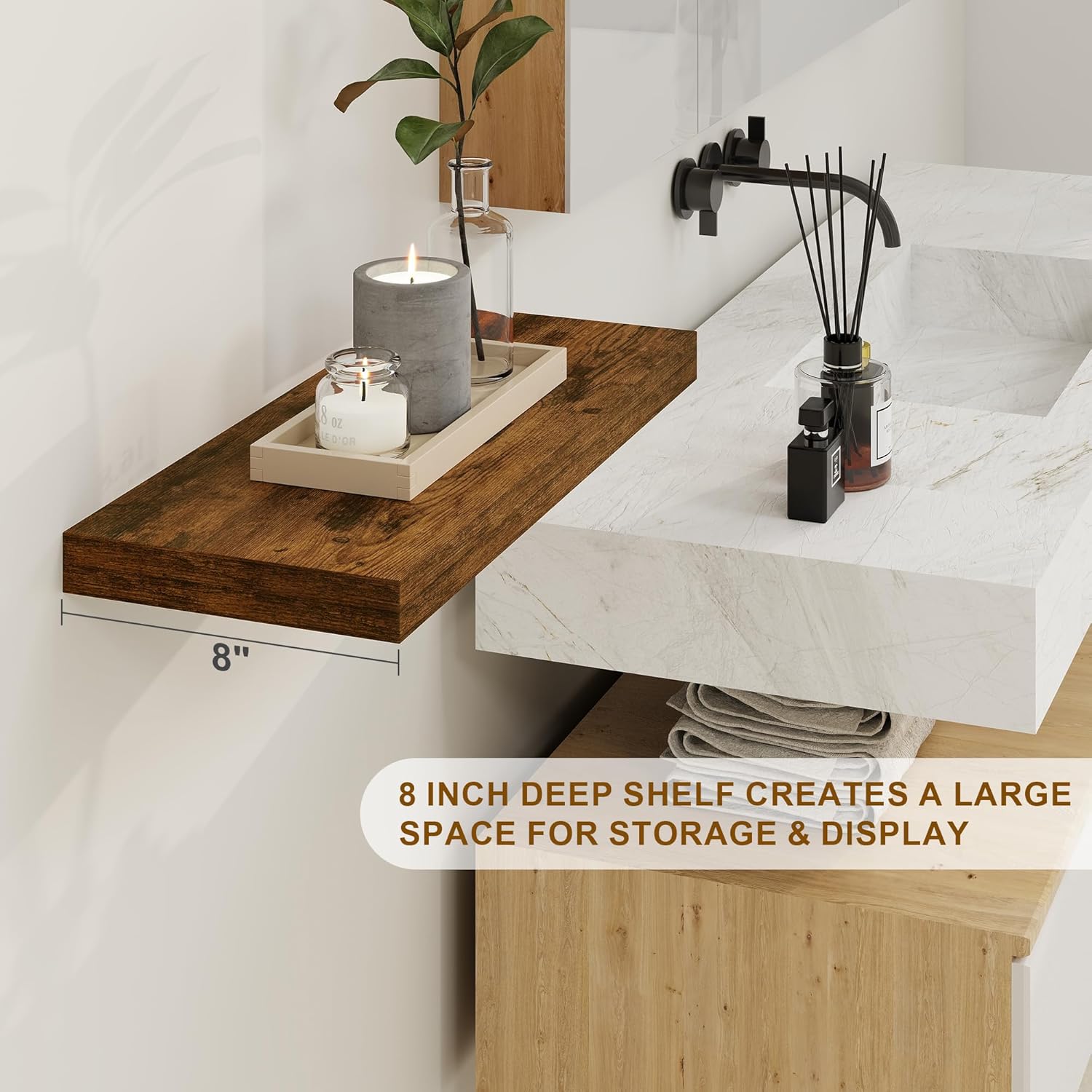 - 【FARMHOUSE RUSTIC WALL SHELF】These floating shelves are made of premium engineered wood board and invisible one-piece bracket. The rustic wooden grain surface add character and warmth to any modern or traditional interior with these thick floating shelves, contrast shelves at staggering heights on the wall or mount side-by-side or in the corner for a clean streamlined look.